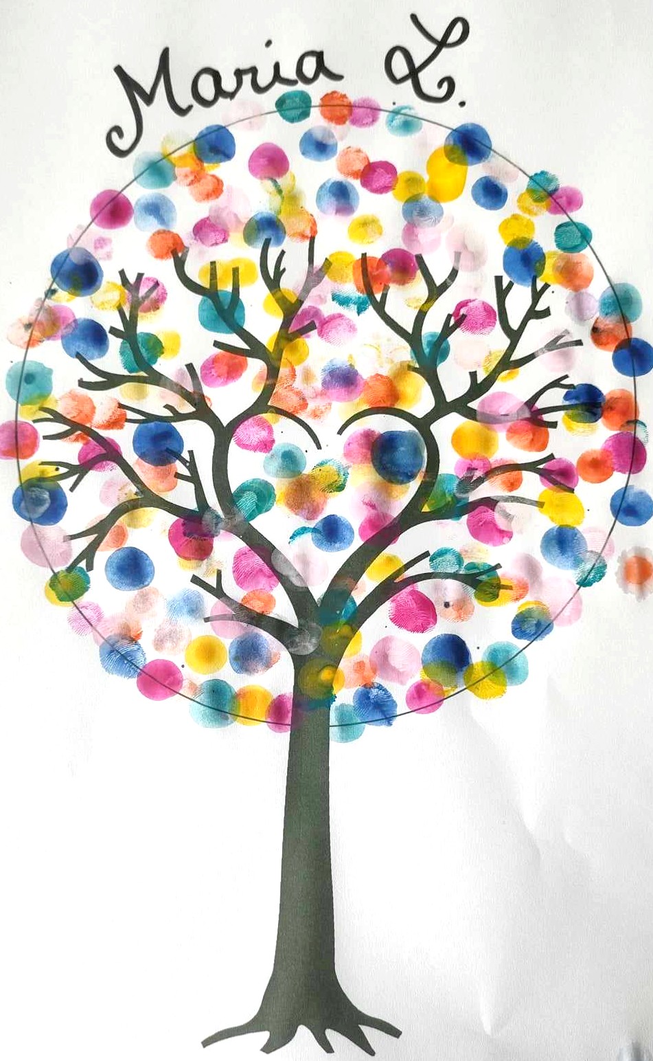 Première étape : Ecrire son prénom autour de l’arbre. Il faut bien sûr guider les élèves et accepter une écriture en lettres capitales pour les CP. La difficulté réside au niveau de la courbe qu’il faut faire prendre aux lettres.