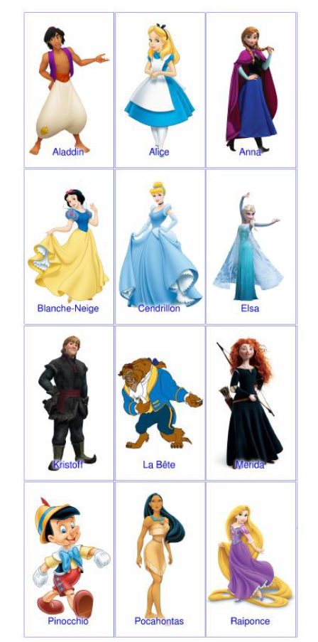 L’enseignant présente les personnages aux élèves en anglais. Une sélection est faire parmi les images pour garder uniquement les personnages que les élèves connaissent.