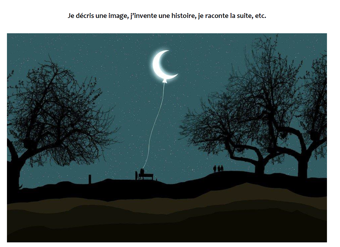 - Raconter la suite des événements : quelque chose qui pourrait se passer dans l’image, un nouveau personnage qui apparaitrait, un retournement de situation, etc.