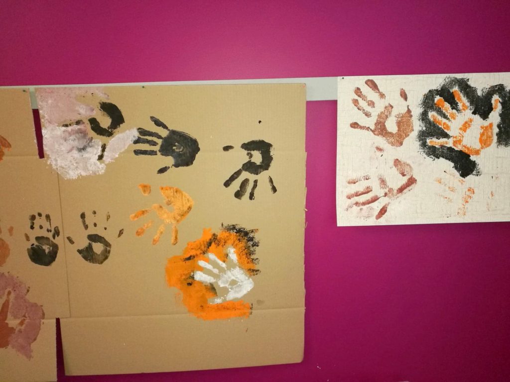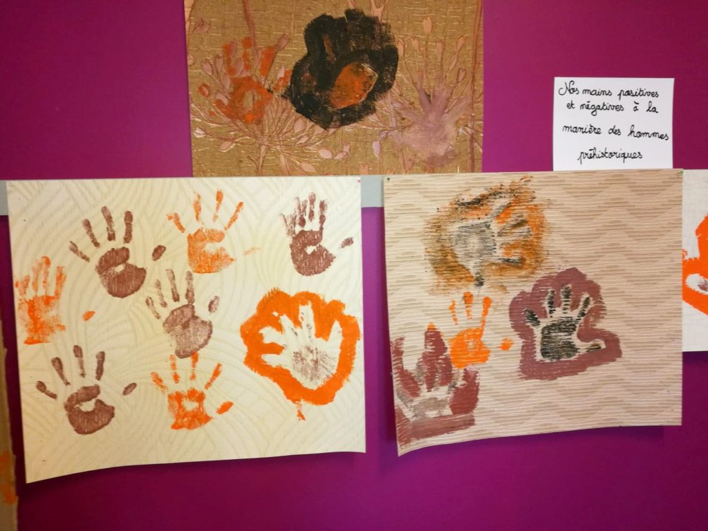 Dans un premier temps, nous avons découvert les hommes préhistoriques et l’art pariétal. Avoir avoir vu des images, des vidéos et lu quelques documentaires sur le sujet, nous nous sommes concentrés sur les empreintes de mains positives et négatives. Et TADAAAM ! Voici le résultat.