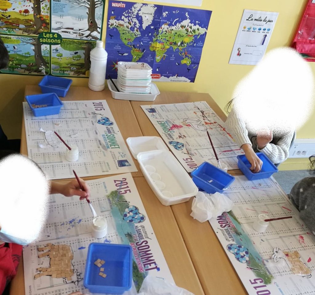 Sur la photo, les élèves sont à l’étape du collage : on peut voir des lapins, une vache et une tortue. 😉