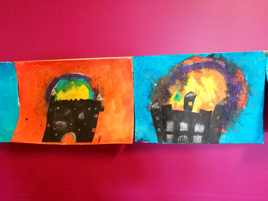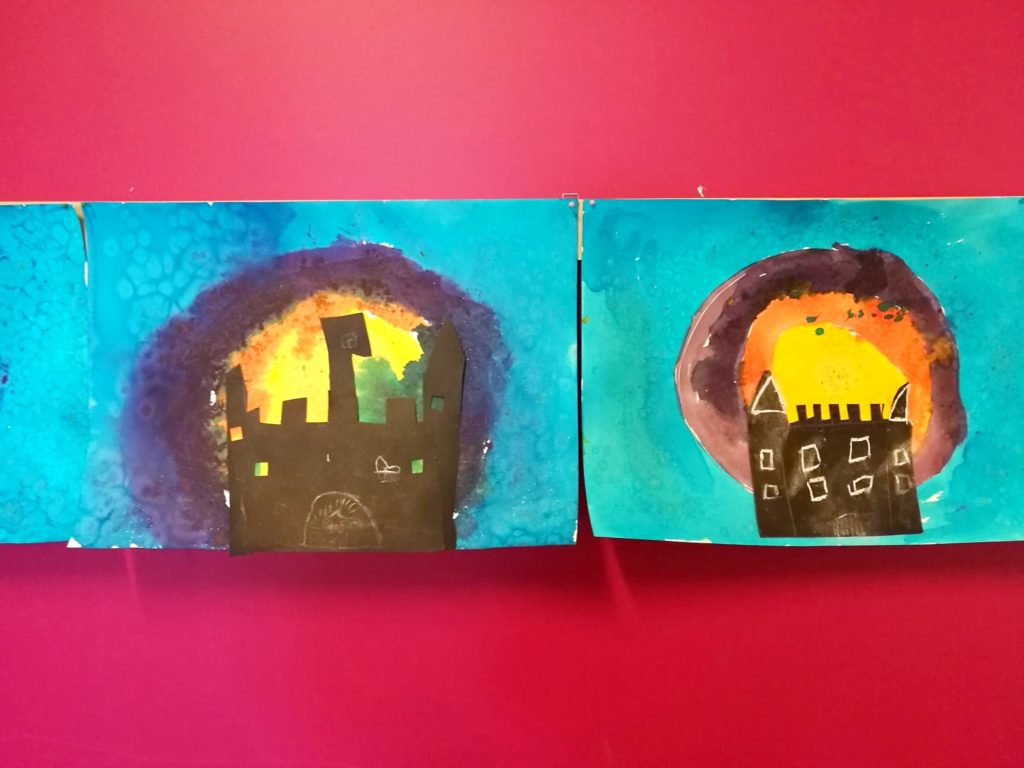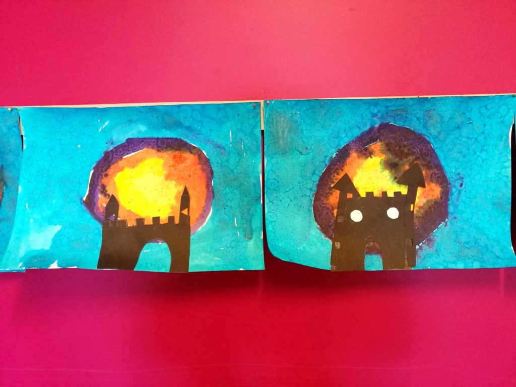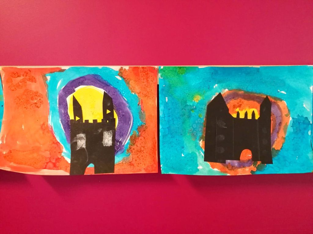 Pour la réalisation en arts visuels, nous sommes partis sur un fond trèèèès coloré à l’encre et au gros sel. Pour le château, ce sont des morceaux de papier noir que les élèves ont eux-mêmes découpé, évidé, agencé, etc. Pour les aider, j’avais récupéré des perforatrices aux formes géométriques. Les dessins et remplissages ont été fait à la craie blanche.