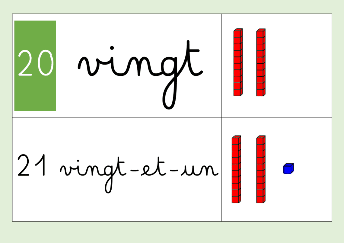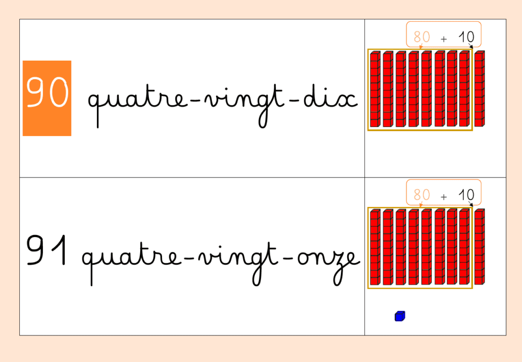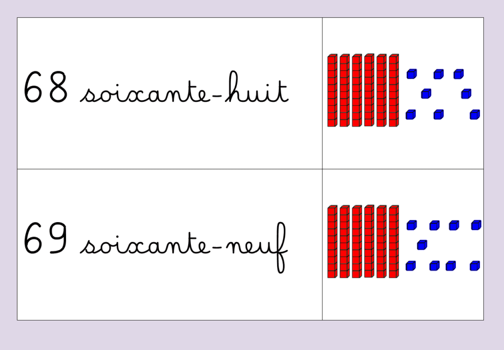 Je vous partage aujourd’hui un petit affichage de mathématiques, qui contient les familles de nombres jusqu’à 99. Pour moi, c’est principalement utile pour que les élèves aient un modèle de l’écriture en lettres.