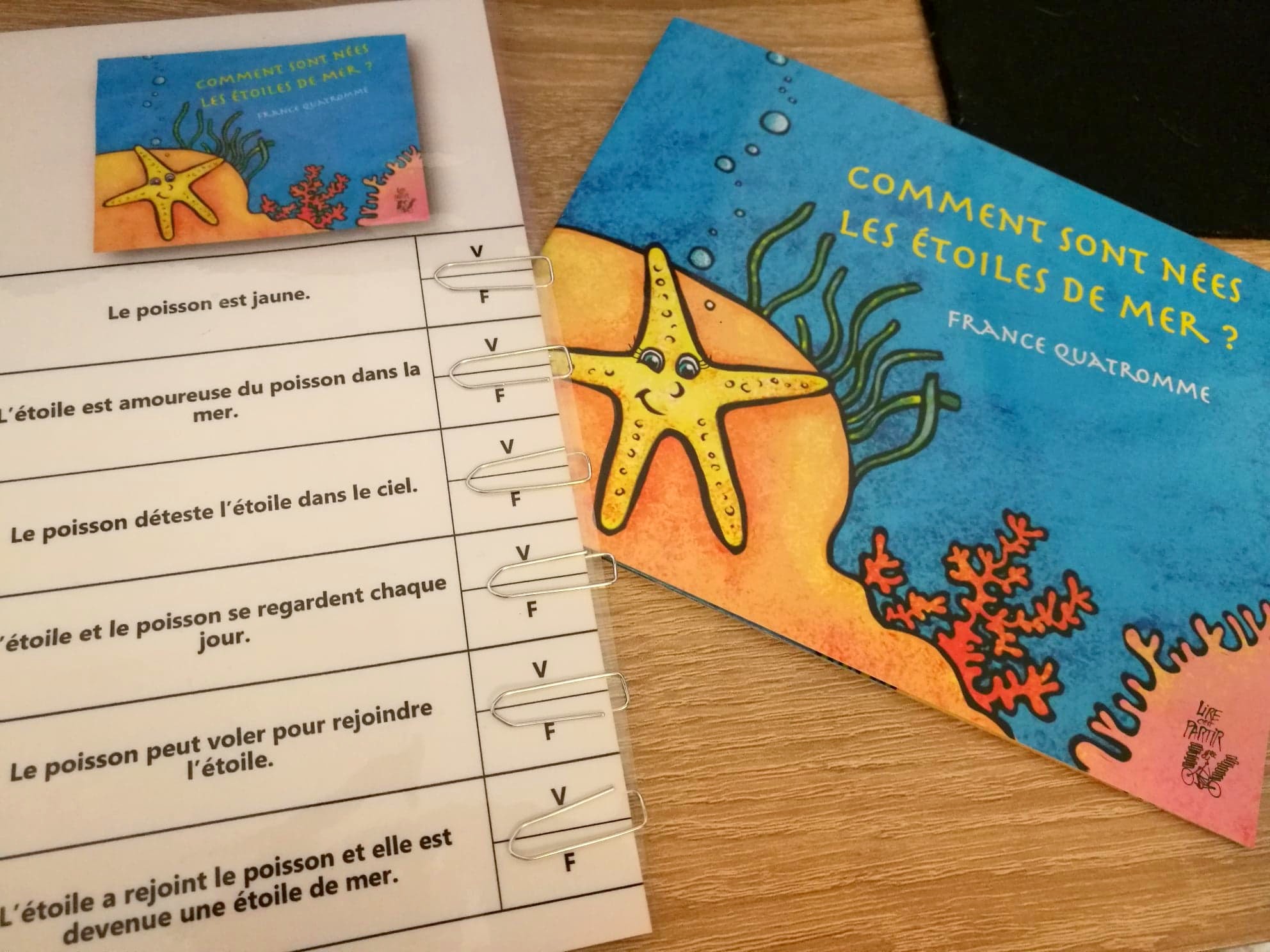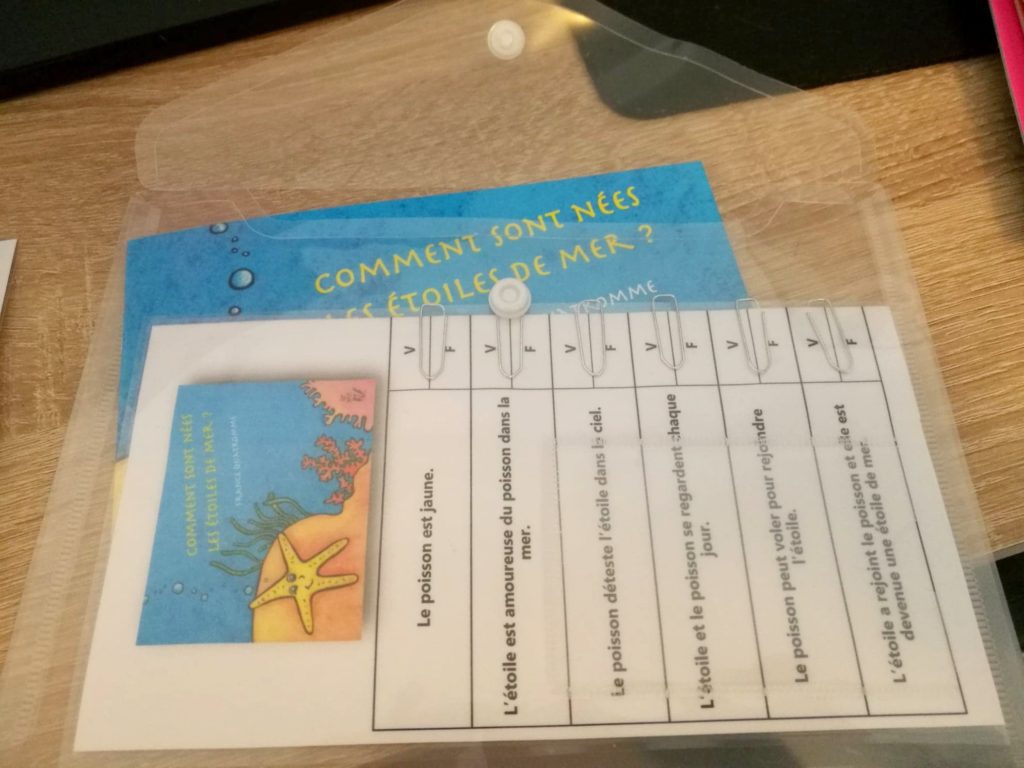 Pour chaque livre, j’ai donc prévu une fiche A5 avec, au recto, les petites phrases à lire et les trombones à placer : V si la phrase est vraie, F si elle est fausse. 😉 Et au verso, la réponse pour que ce soit autocorrectif.