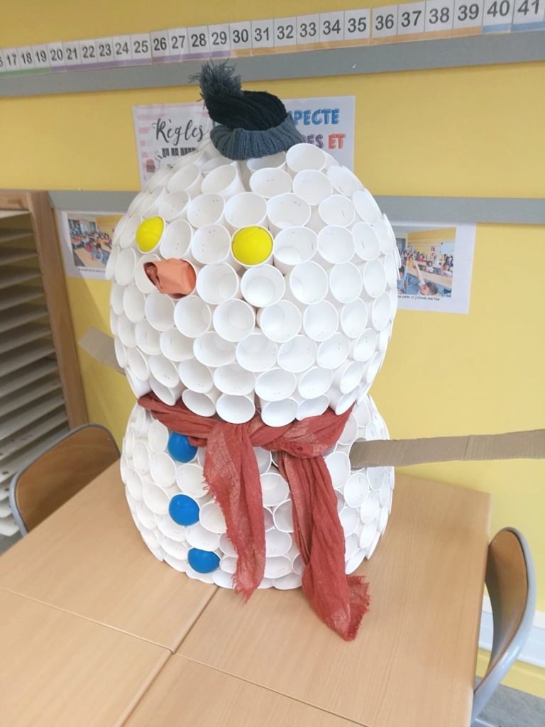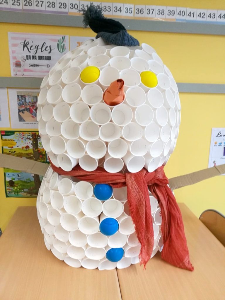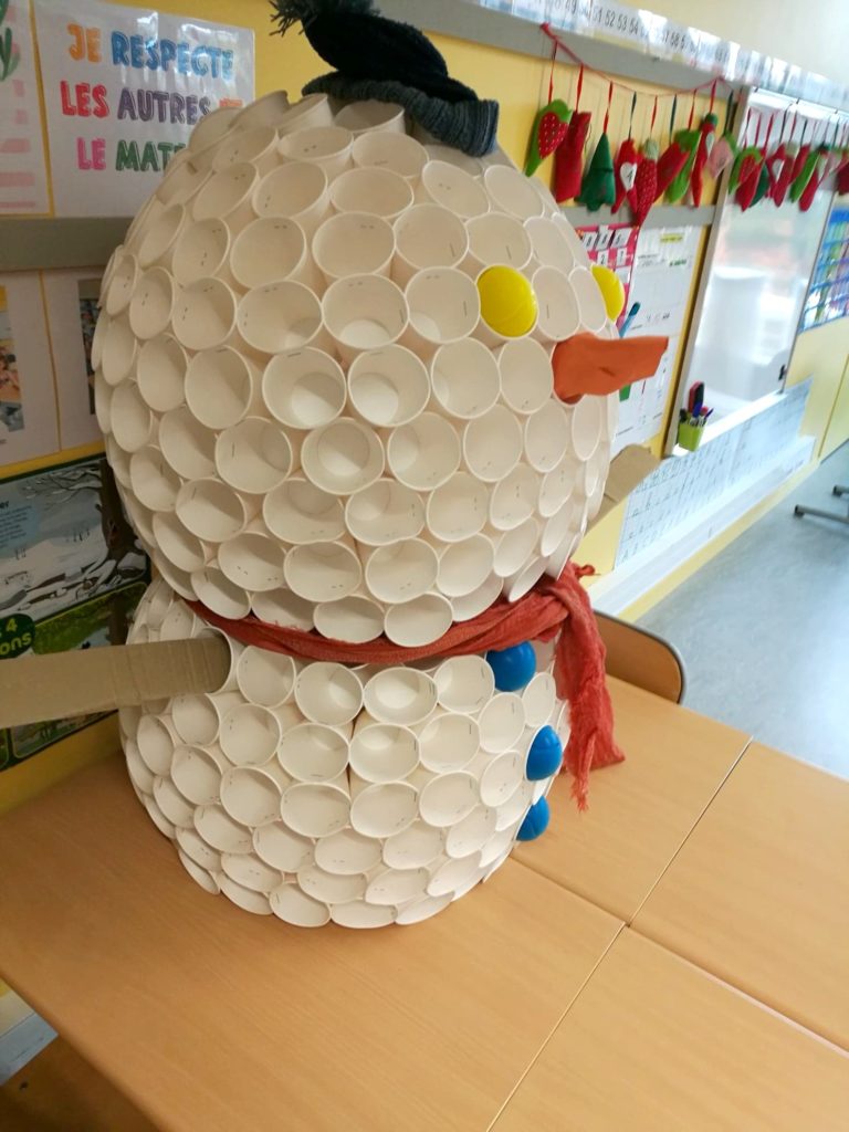 C’est un bonhomme de neige en gobelets de carton. Il y a plein de tutos sur le net pour apprendre à en faire un ! Les gobelets forment de petits « réservoirs » tout autour du bonhomme, j’ai pensé y ranger des choses : étiquettes, cartes son, jeux de phono, matériel de manip en maths, etc. Mais j’ai peur que ça manque de clarté, et il y a bien trop d’emplacements disponibles !