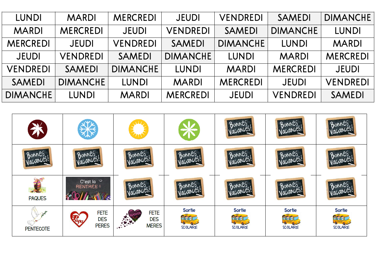 Pour indiquer les bons jours de la semaine, il suffit d’accrocher la bandelette correspondante. Si par exemple le 1er novembre est un mardi, on affiche la bandelette qui commence par le mardi, et on est tranquille pour tout le mois.