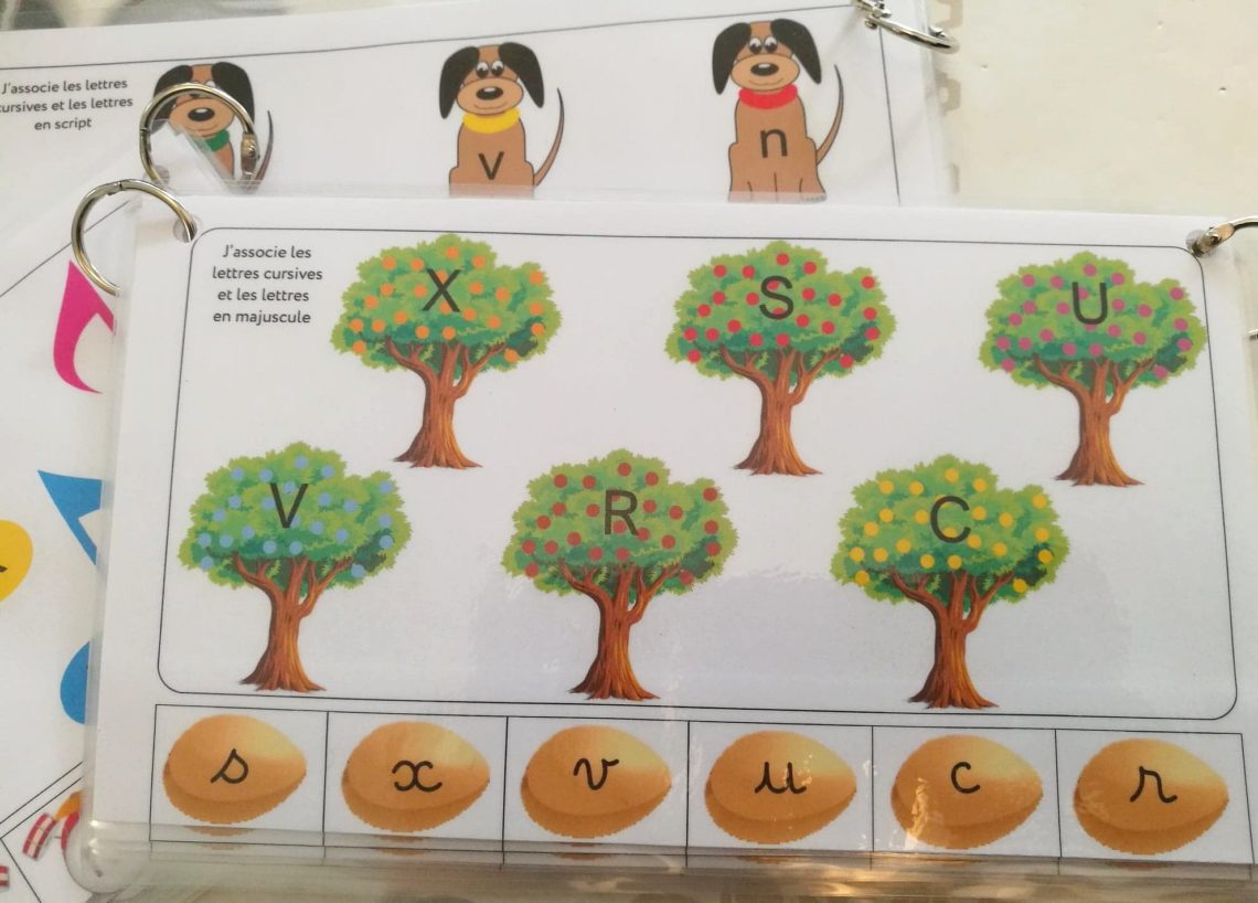 Ce sont des cartes à pinces où il faut trouver deux lettres identiques dans des écritures différentes.