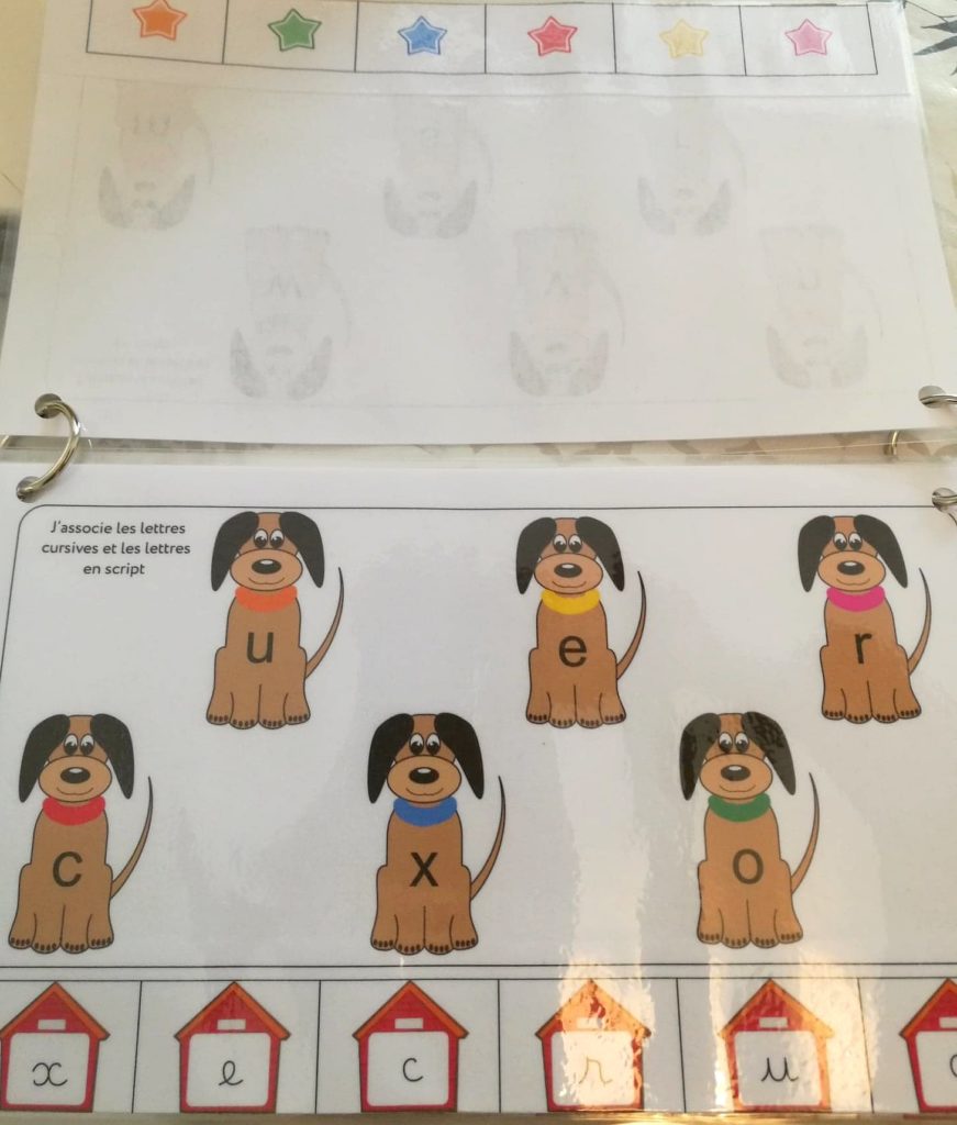 Ce sont des cartes à pinces où il faut trouver deux lettres identiques dans des écritures différentes.