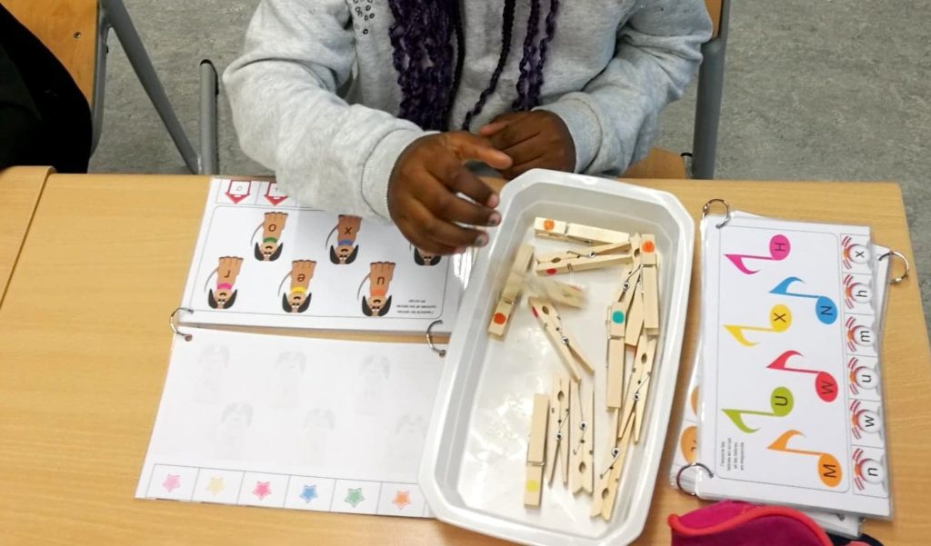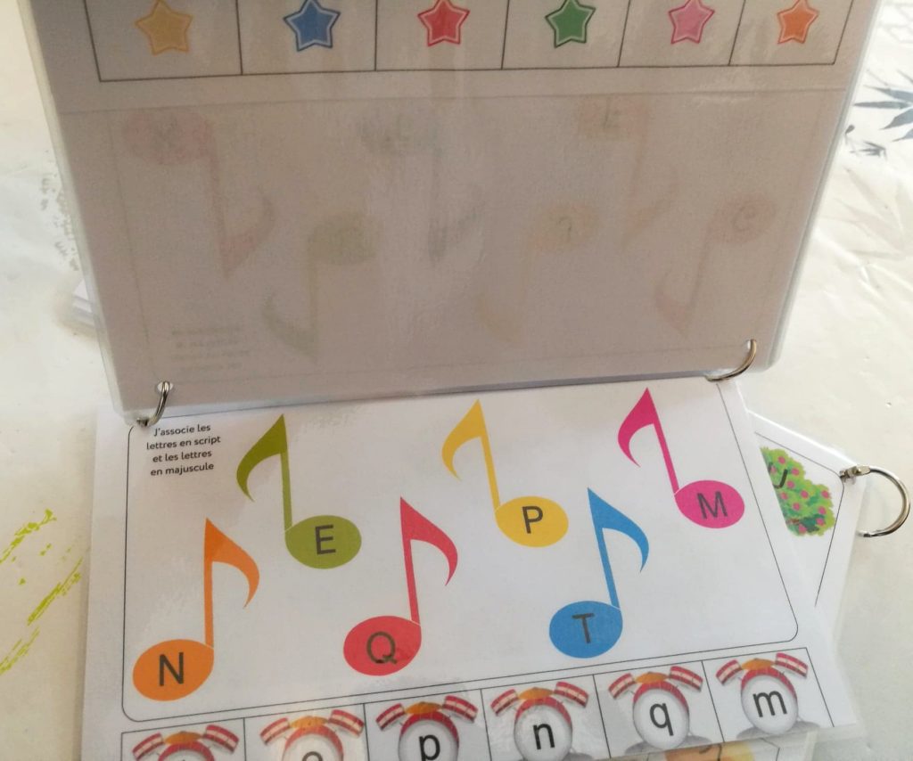 Vous avez l’exercice en lui-même sur le recto : c’est là que l’élève va placer ses pinces à linge colorées. Il place par exemple la pince orange sur le « u » qui va correspondre au « U » du chien qui a un collier orange. Ou encore la pince rose sur le M qui correspond au « m » sur la note de musique rose.