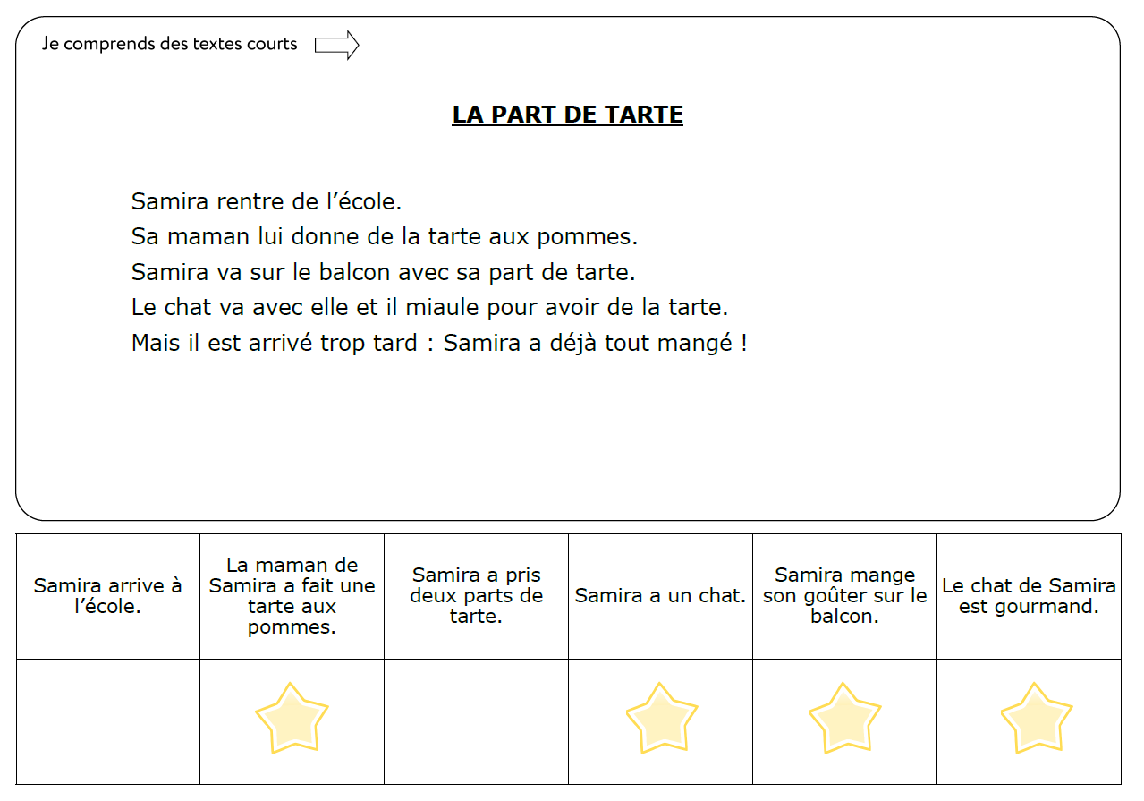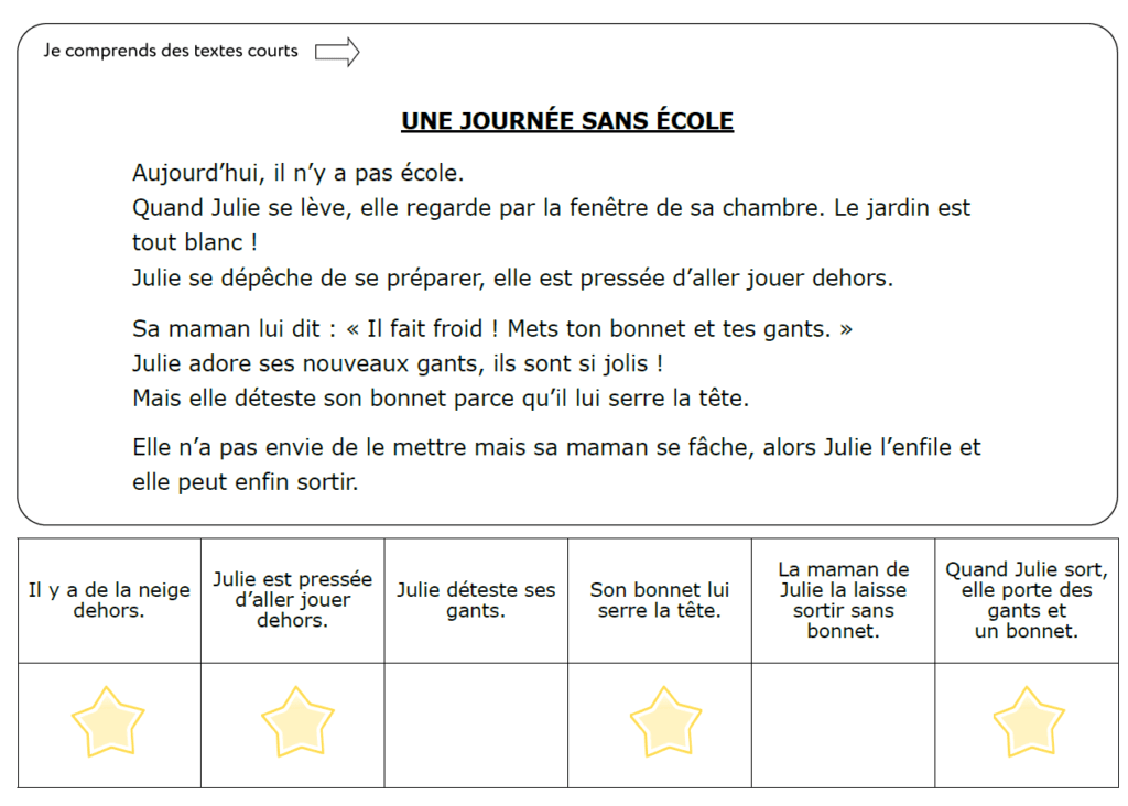 Et pour cela, c’est très simple ! Ils doivent lire méticuleusement le texte : une fois, deux fois, voire trois fois si nécessaire. Puis lire une affirmation et placer une pince à linge s’ils pensent qu’elle dit la vérité. Pour cela, tous les textes sont rangés dans une barquette avec un petit lot de pinces à linge à disposition des élèves. Ensuite, ils retournent la carte et vérifient grâce aux étoiles s’ils se sont trompés ou non.