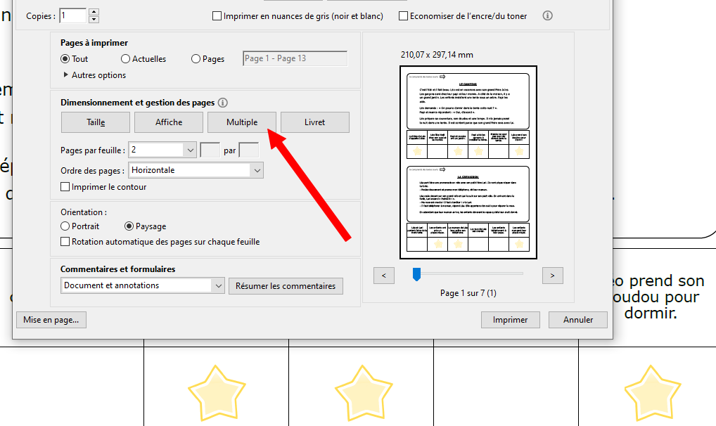 • Imprimé le fichier. J’ai choisi de mettre chaque carte au format A5, et ça suffit amplement (voir l’image ci-contre pour imprimer en « multiple » depuis le PDF) ;