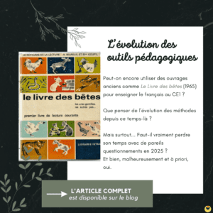 Controverse pédagogique : l’évolution des manuelsPeut-on encore utiliser des ouvrages anciens comme Le Livre des bêtes (1965) pour enseigner le français au CE1 ? Que penser de l’évolution des pratiques pédagogiques depuis ce temps-là ? Mais surtout… Faut-il vraiment perdre son temps avec de pareils…