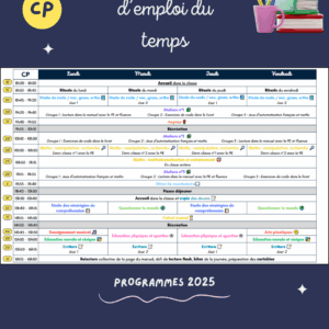 Comme chaque année, je partage ici mon emploi du temps de rentrée pour le CP. J’ai repris la trame de l’an dernier, avec quelques ajustements pour coller aux nouveaux repères des programmes 2024 (qui, rappelons-le, ne changent pas les horaires…