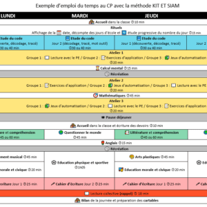 Emploi du temps CP 2023-2024Bonjour à tous, Vous trouverez ci-dessous un exemple d’emploi du temps avec la méthode Kit et Siam ! Quelques précisions : Les séances de code en début d’année (P1, P2 et P3) durent 40 minutes, alors que celles de fin d’année…
