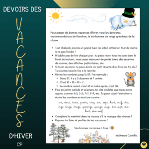 Après les devoirs pour les vacances d’automne et celles de fin d’année, voici la suite logique : les devoirs des vacances d’hiver ! Comme d’habitude, je préconise surtout un peu de lecture quotidienne, des petits calculs et beaucoup de repos…
