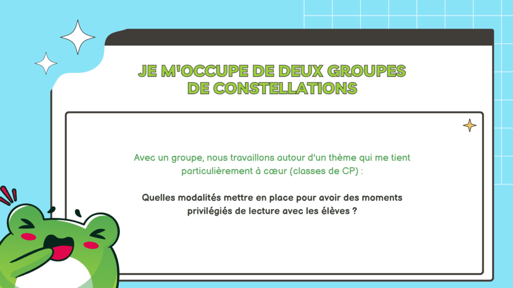 J’ai donc ma première constellation ce mercredi. J’ai choisi de travailler en français, avec des collègues de cycle 2. C’est ce que je maitrise le mieux, je me sens parfaitement à l’aise avec les programmes et les recommandations officielles sur ce cycle.