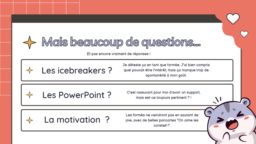 Je m’interroge aussi beaucoup sur les PowerPoint qu’on « montre » en formation. Il faut reconnaitre que souvent, ils ne servent à rien, à part occuper un peu les collègues qui dorment au fond de la salle et qui analysent les images que vous avez mises. En même temps, je trouve que c’est un support rassurant pour le formateur. Mais je n’aime pas quand les formateurs nous envoient leur PowerPoint en mode « voici la trace écrite de la séance », alors qu’une trace écrite, elle est faite à partir de ce qu’il s’est justement passé pendant la formation. Enfin, je ne sais pas… Je n’ai pas de solution miracle pour le moment !