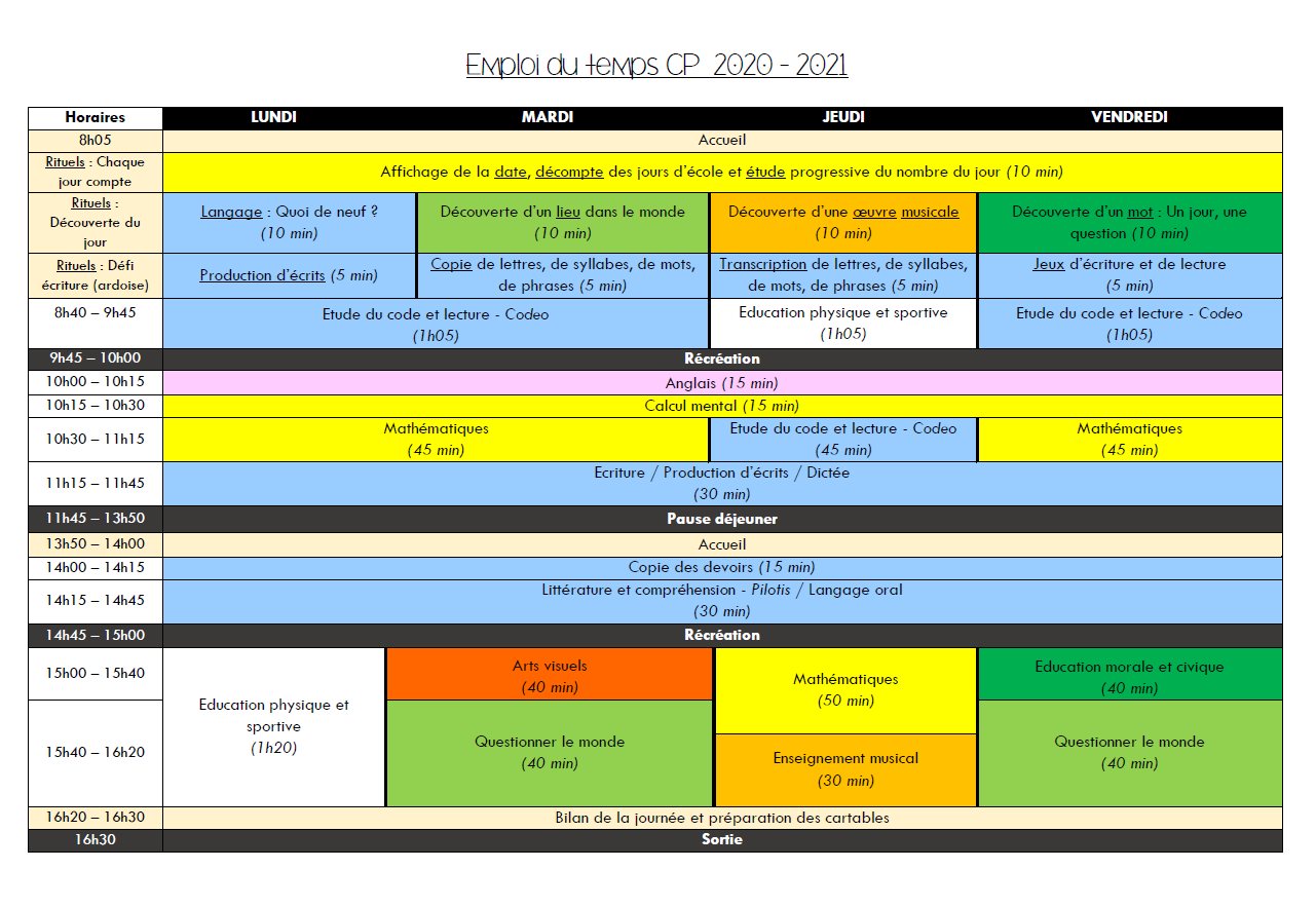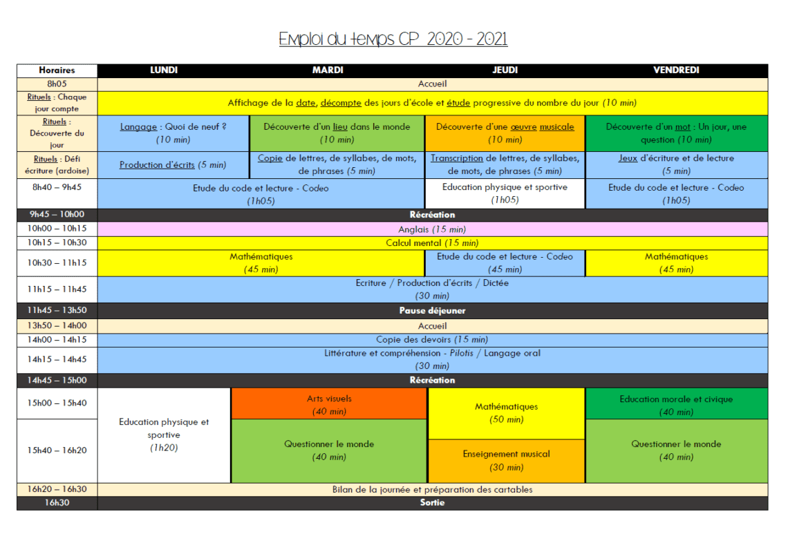 Emplois du temps Emploi du temps CP 2020 / 2021 8 août 2020 / No Comments Bonjour ! Je vous avais proposé l’année dernière un emploi du temps CP – CE1. Voici l’emploi du temps version 2020 pour mes CP ! J’ai fait pas mal de modifications en Période 1, et il risque de beaucoup changer encore au cours de l’année ! 😉Plus d’informations sur les rituels du matin ici ! Emploi du temps Volume horaire hebdomadaire Le document : Emploi du temps CP 2020-2021 Partager : Cliquez pour partager sur Facebook(ouvre dans une nouvelle fenêtre) Facebook Cliquer pour partager sur X(ouvre dans une nouvelle fenêtre) X Cliquez pour partager sur Pinterest(ouvre dans une nouvelle fenêtre) Pinterest Cliquez pour partager sur WhatsApp(ouvre dans une nouvelle fenêtre) WhatsApp J’aime ça :J’aime chargement… Articles similaires