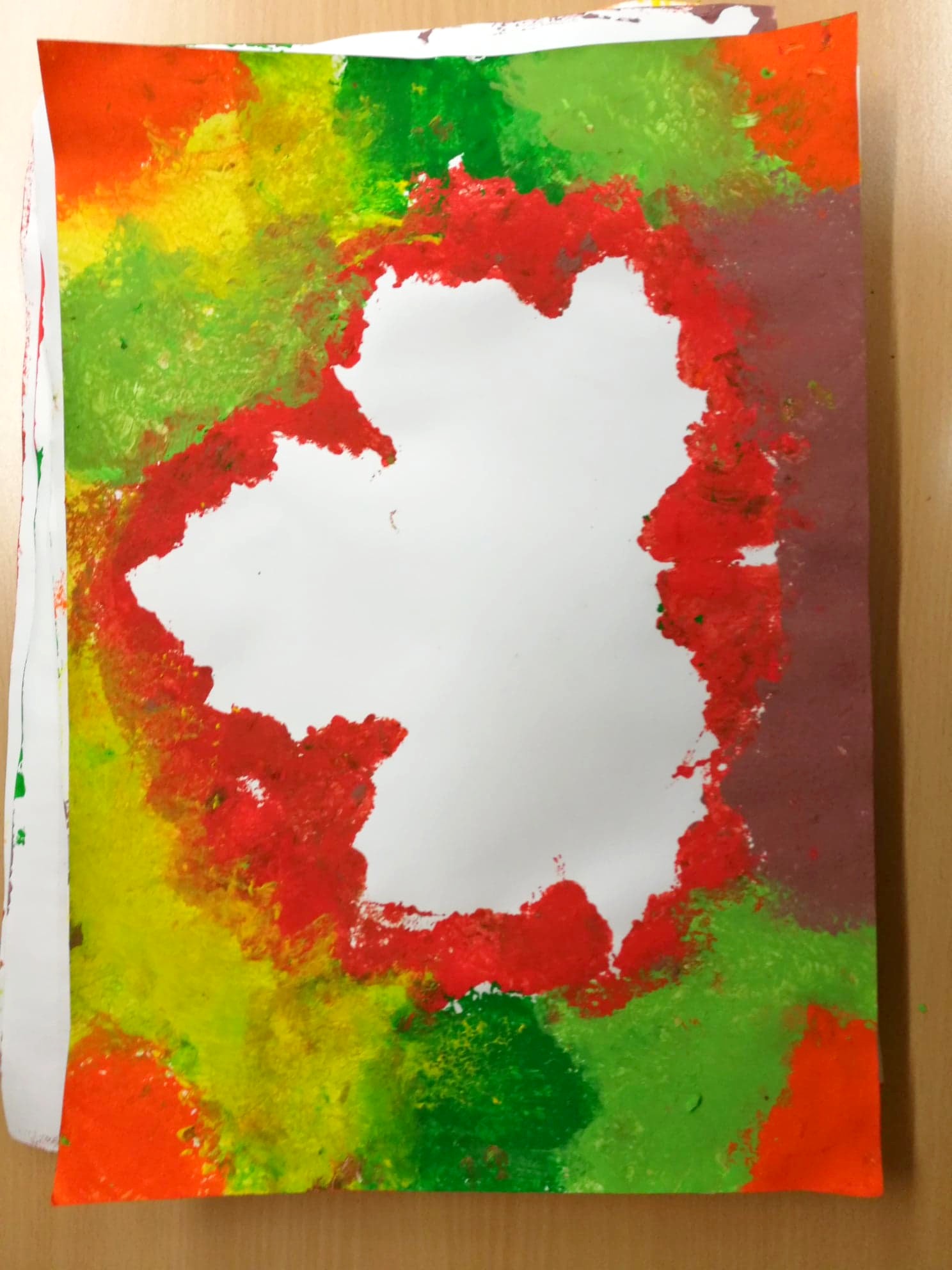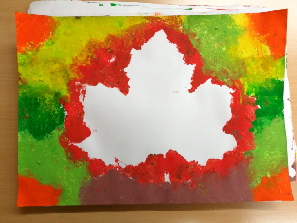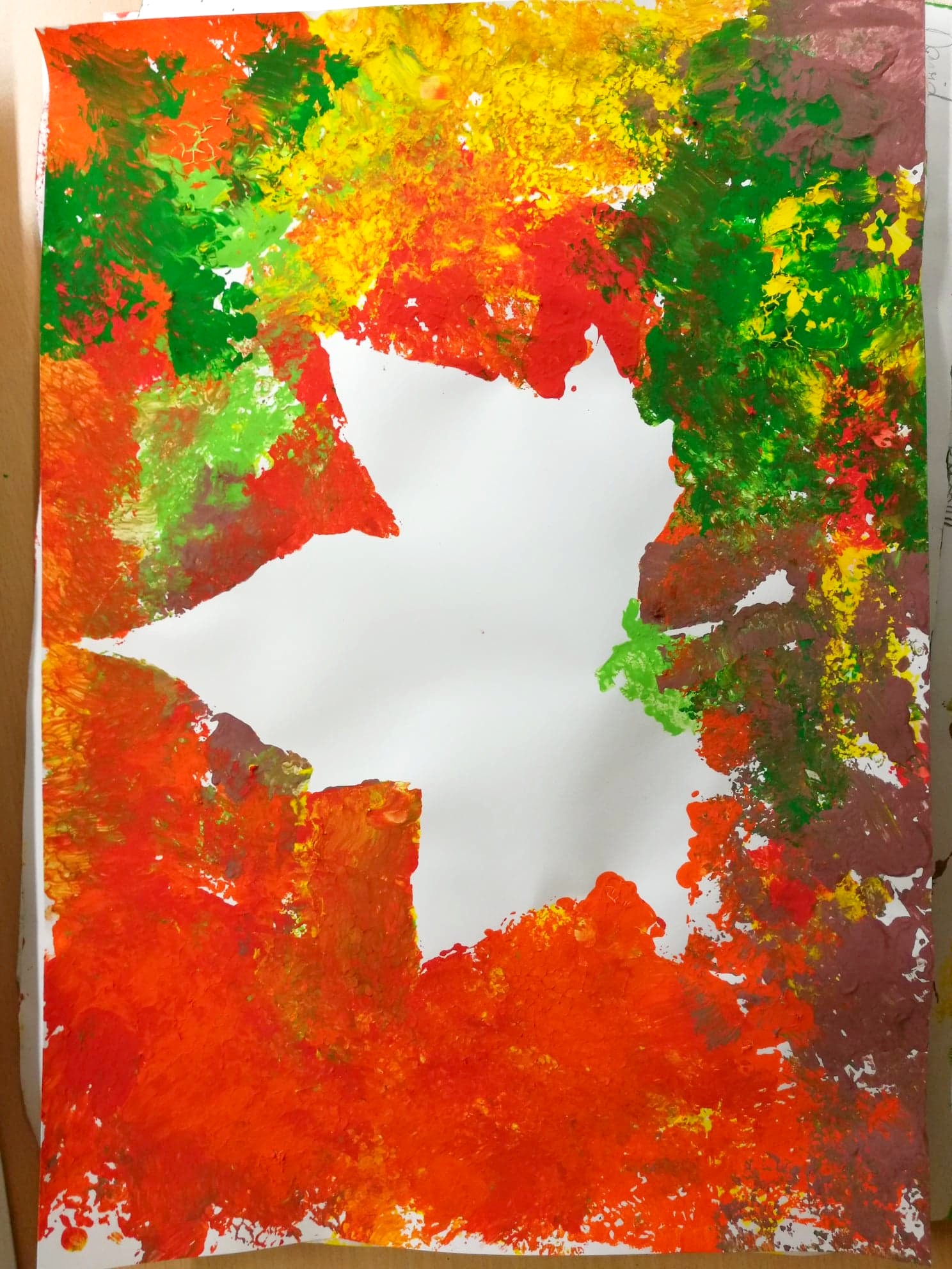 Avec l’éponge, tapoter le fond de gouache. Bien insister sur le tour de la feuille d’automne.