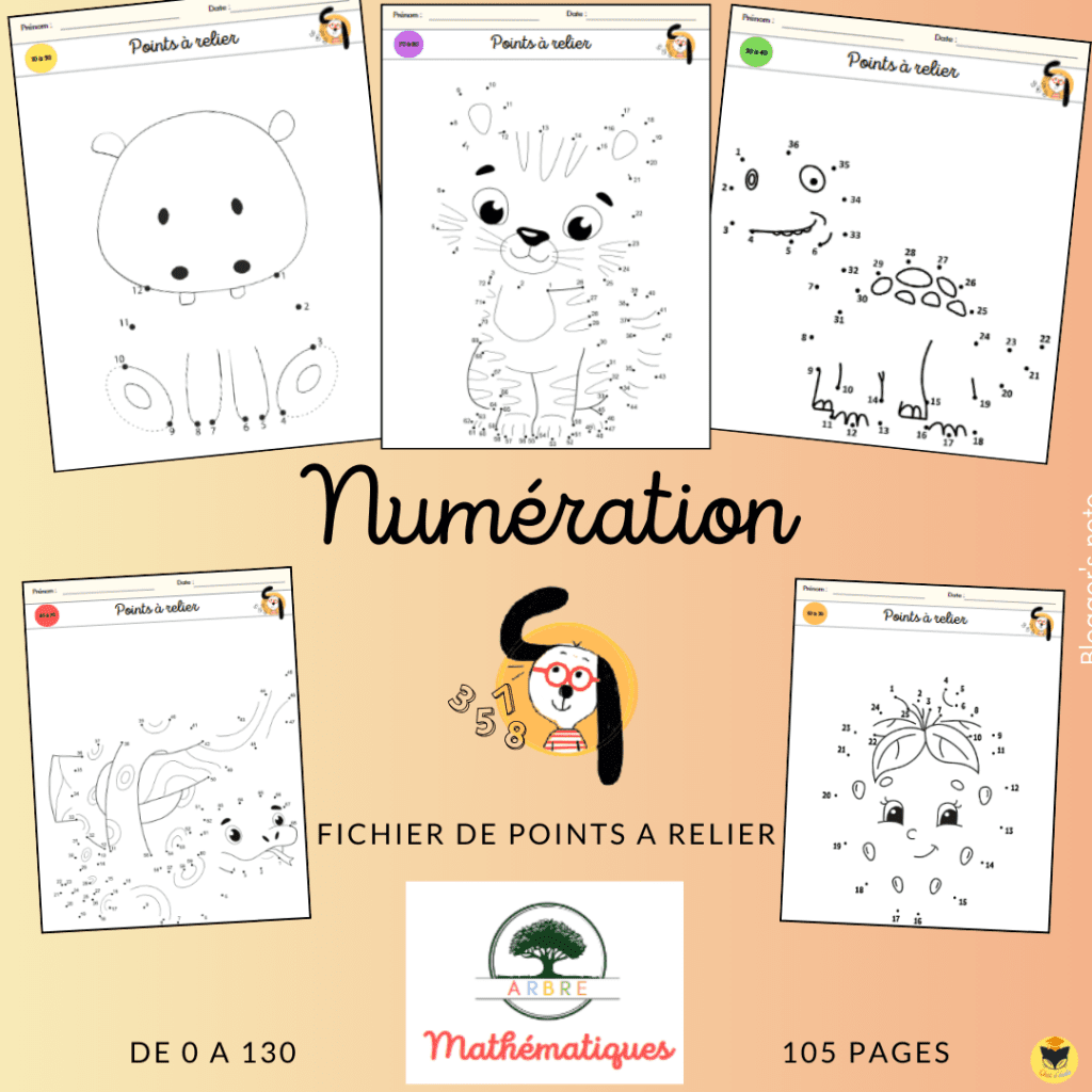 Vous trouverez donc 105 pages d’activités de numération, autour des points à relier. La progression est toujours représentée par des points de couleur. Et les fiches vont de 0 à 100, avec deux ou trois qui montent jusqu’à 130 en toute fin de fichier.