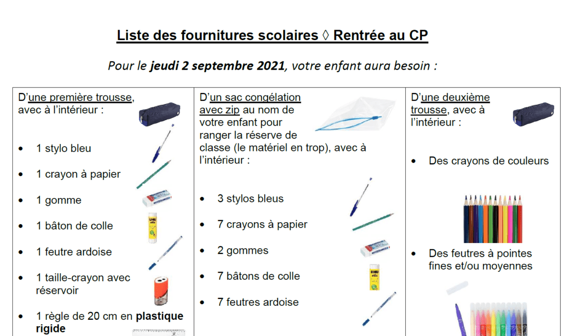 Rien de bien particulier, à part que nous demandons du petit matériel en plusieurs quantités (crayons de papier, colles, etc. pour faire une réserve en classe… au lieu de demander à nouveau aux parents au fil de l’année).