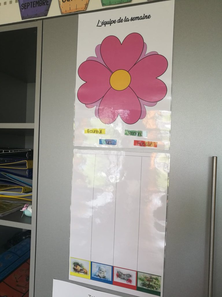 Au-dessus de ce tableau, j’ai affiché une grande fleur où j’afficherai l’étiquette de l’équipe de la semaine.