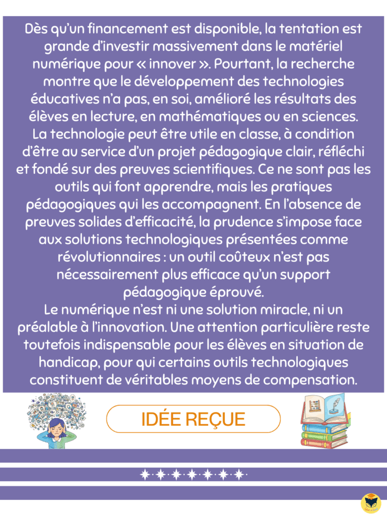 Les outils technologiques peuvent être utiles à condition d’être au service d’un projet pédagogique clair, explicite, et fondé sur des connaissances scientifiques solides. Ce ne sont ni les tablettes, ni les applications, ni les supports interactifs qui produisent les apprentissages, mais bien les pratiques pédagogiques qui les accompagnent.