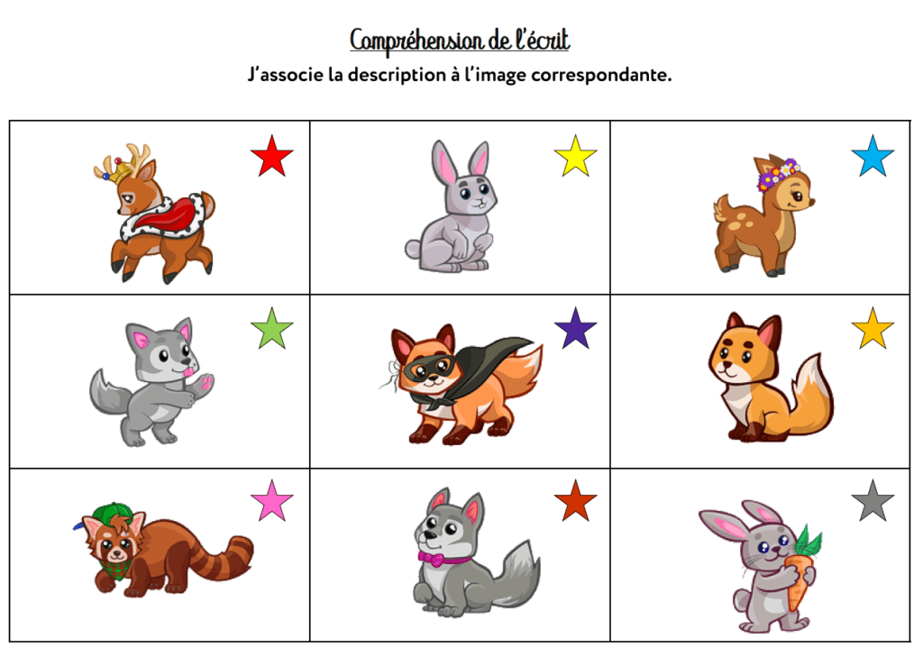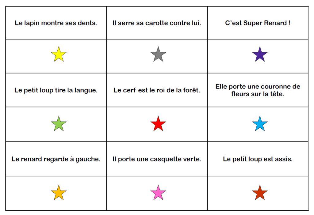Sur l’exemple ci-contre, la description « C’est Super Renard ! » correspond à l’image où l’on voit un renard masqué, l’étoile violette. C’est donc l’étoile violette qui sera au dos de cette description.