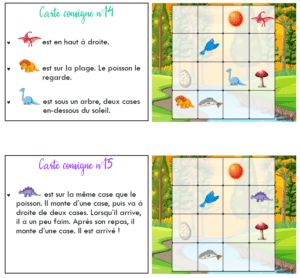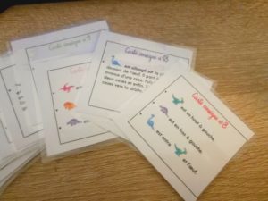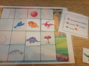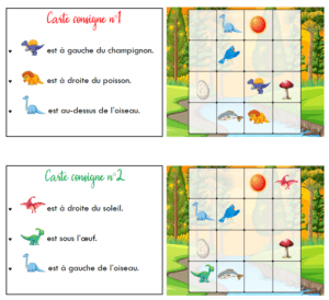 Français, Maths Jeu de topologie : les dinosaures 26 juin 2021 / 1 Comment J’ai complètement oublié de vous partager ce jeu, qui est dans ma classe depuis quelques mois maintenant. 😉Mes élèves ont littéralement adoré cet atelier, je pense que c’est leur préféré depuis le début de l’année – sûrement l’effet dinosaures ! Avant de se lancer dans cette activité, il faut quelques prérequis :Les élèves doivent pouvoir lire de petites phrases ;Ils doivent connaitre le vocabulaire de repérage spatial : à droite, à gauche, sous, à côté, etc. ;Pour les dernières cartes, les plus complexes, il faut avoir étudié le déplacement sur quadrillage. Je considère que c’est donc un jeu assez transversal, qui nécessite à la fois des compétences en français et en maths. Vous trouverez le but du jeu et toutes les infos pour préparer l'activité dans le document ! Exemples de cartes "consignes", avec les réponses au dos (il suffit de plier la feuille en deux avant de plastifier). Les élèves doivent placer les dinosaures sur le plateau de jeu, en respectant les indications sur la carte "consigne". Vérification du placement des dinosaures, grâce aux réponses au dos de la carte "consigne". Les étiquettes dinosaures à découper et plastifier, et le plateau de jeu. Quelques cartes "consignes". Il y en a 18 en tout ! Exemples de cartes plus difficiles. Le document : Jeu de lecture et de topologie - dinosaures Partager : Cliquez pour partager sur Facebook(ouvre dans une nouvelle fenêtre) Facebook Cliquer pour partager sur X(ouvre dans une nouvelle fenêtre) X Cliquez pour partager sur Pinterest(ouvre dans une nouvelle fenêtre) Pinterest Cliquez pour partager sur WhatsApp(ouvre dans une nouvelle fenêtre) WhatsApp J’aime ça :J’aime chargement… Articles similaires