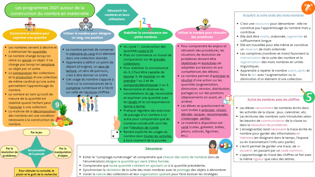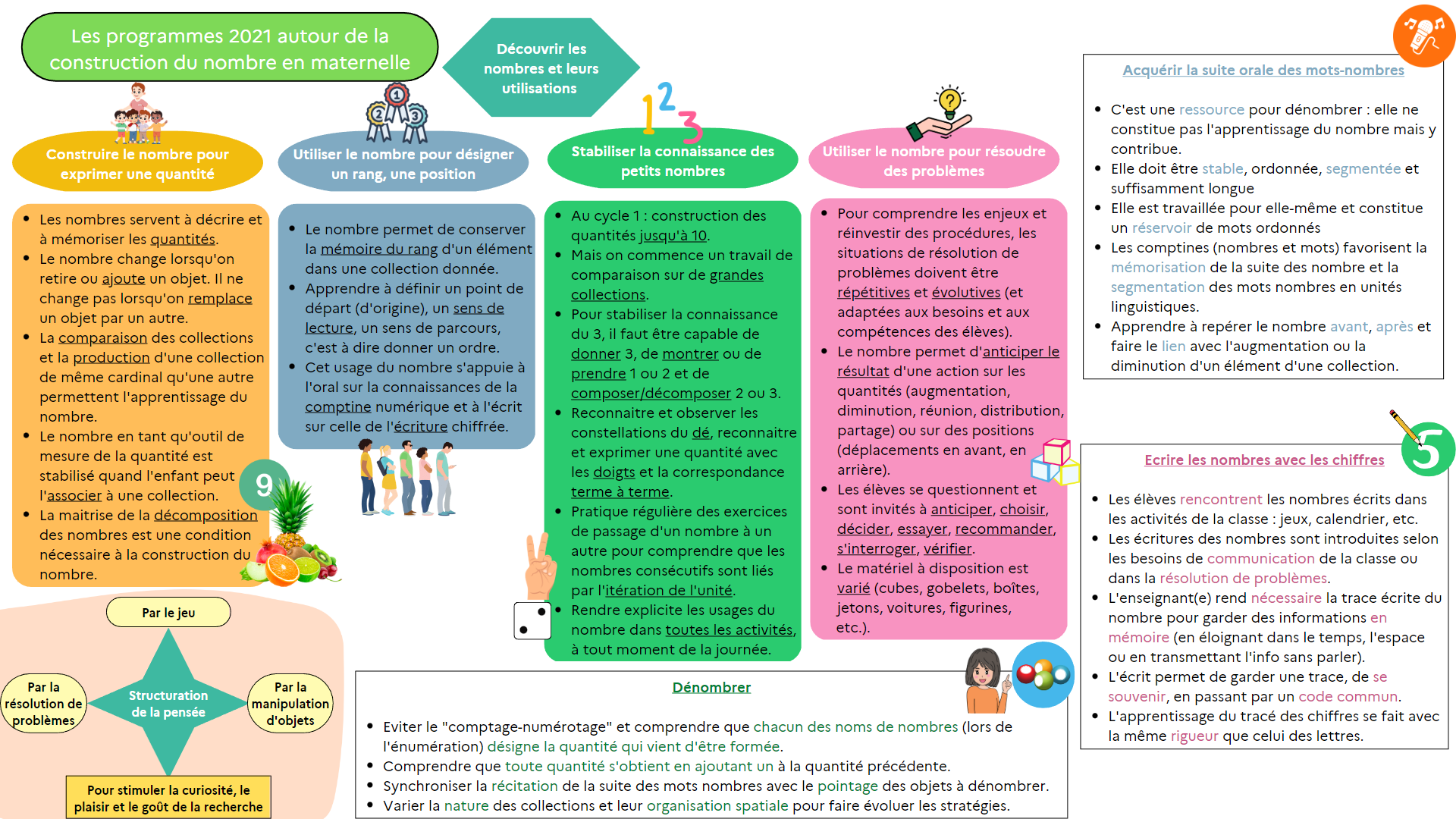 Vous trouverez ci-dessous un petit visuel (réalisé sur Canva) qui reprend les principaux éléments des programmes2021 autour de la construction du nombre en maternelle.