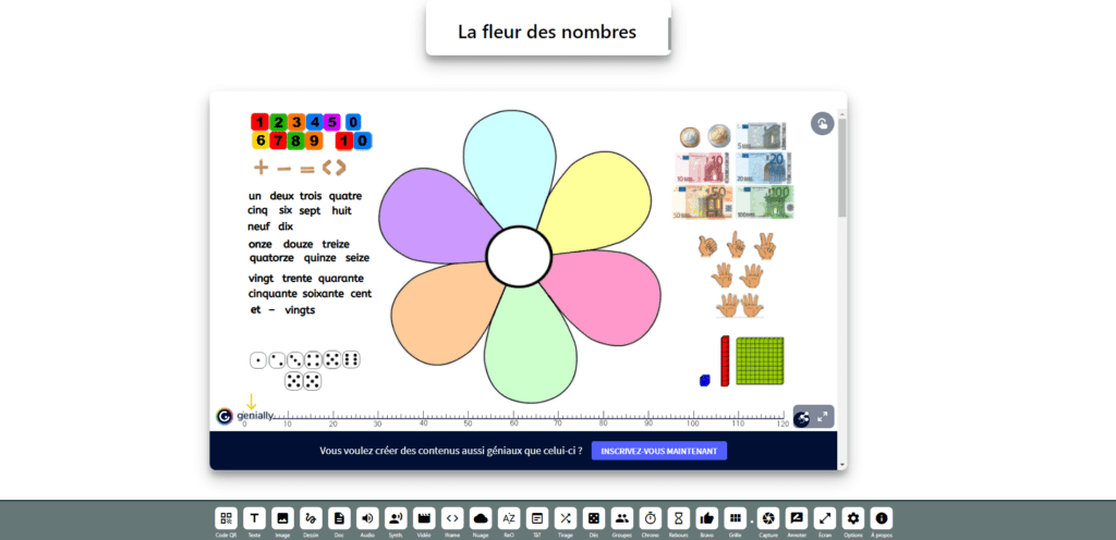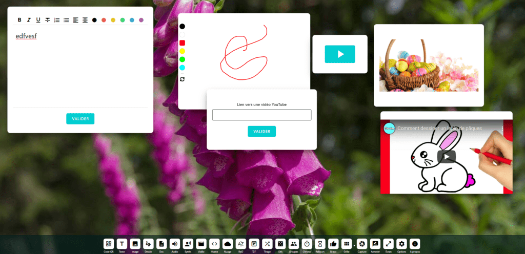 Vous pouvez annoter, glisser des documents, des fichiers audio, des vidéos, des images, des exercices interactifs, des nuages de mots, etc.