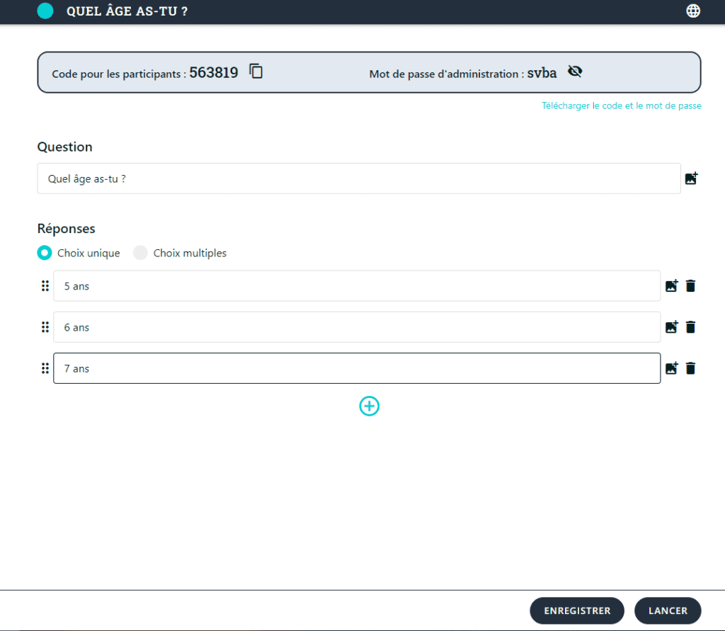 Pour accéder aux quizz ou aux sondages, vous avez un lien à ne pas perdre. Pour le modifier ou consulter les résultats, vous avez également un mot de passe administrateur à conserver. Vous pouvez télécharger ces infos sur un p’tit doc pour éviter des bêtises. 😉