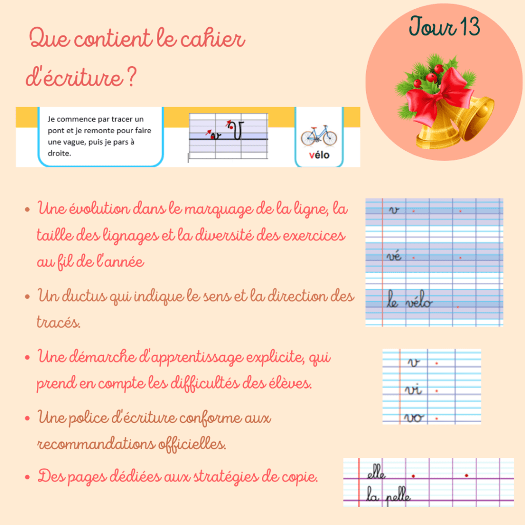 🧵 A travers le cahier d’écriture et au fil des différentes séances, les élèves font le lien avec les apprentissages de la maternelle. Des activités spécifiques permettent également de travailler la préparation à l’écriture : la posture, la position du bras, l’inclinaison du cahier, la gym des doigts, etc.