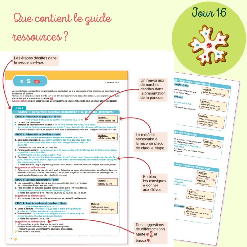 🟡 Concrètement, le guide ressources inclut une présentation détaillée de chaque période de l’année, en décrivant les enjeux de celle-ci, les difficultés des élèves qu’il faut anticiper, les séquences-types, les démarches proposées ou encore l’évolution des supports.