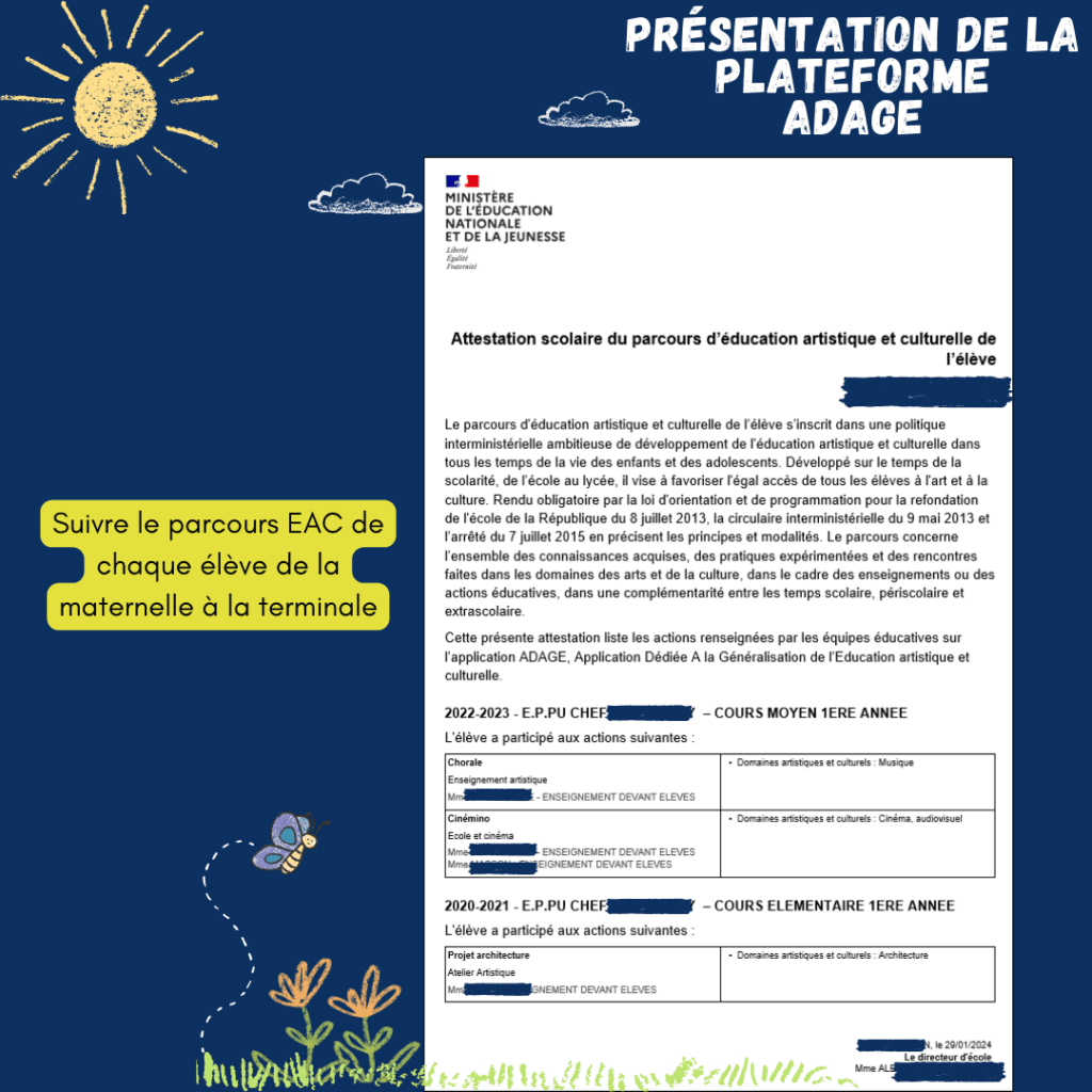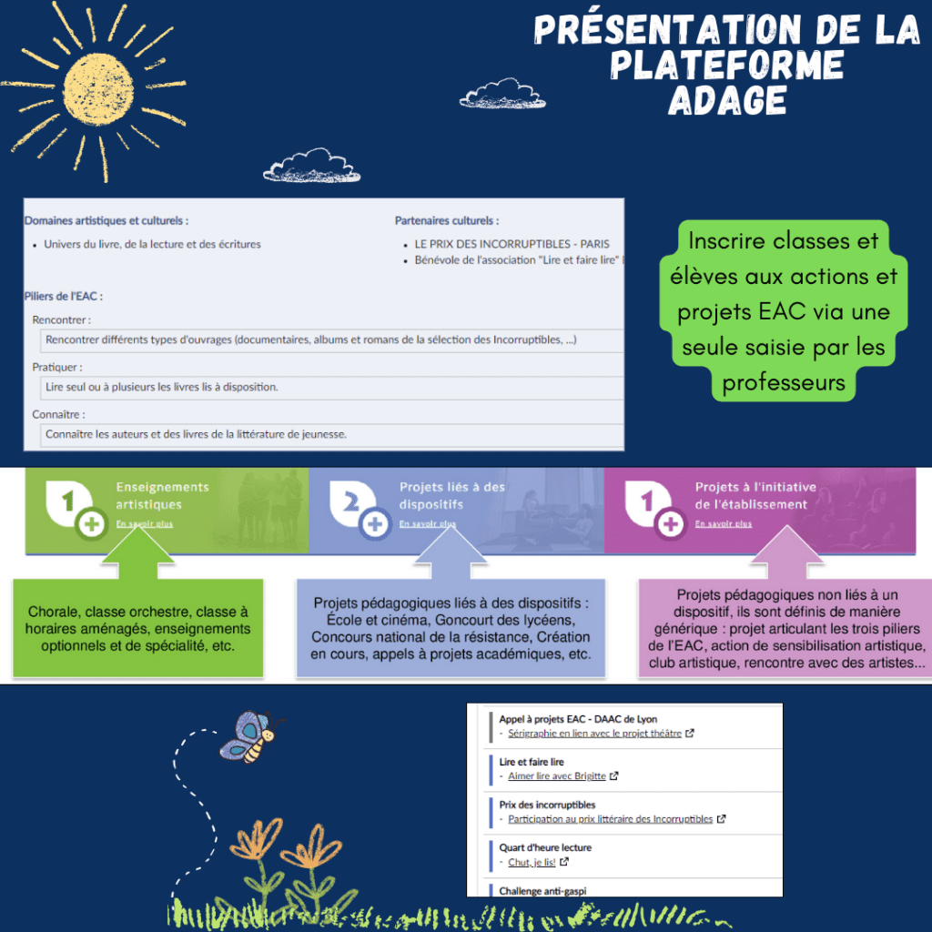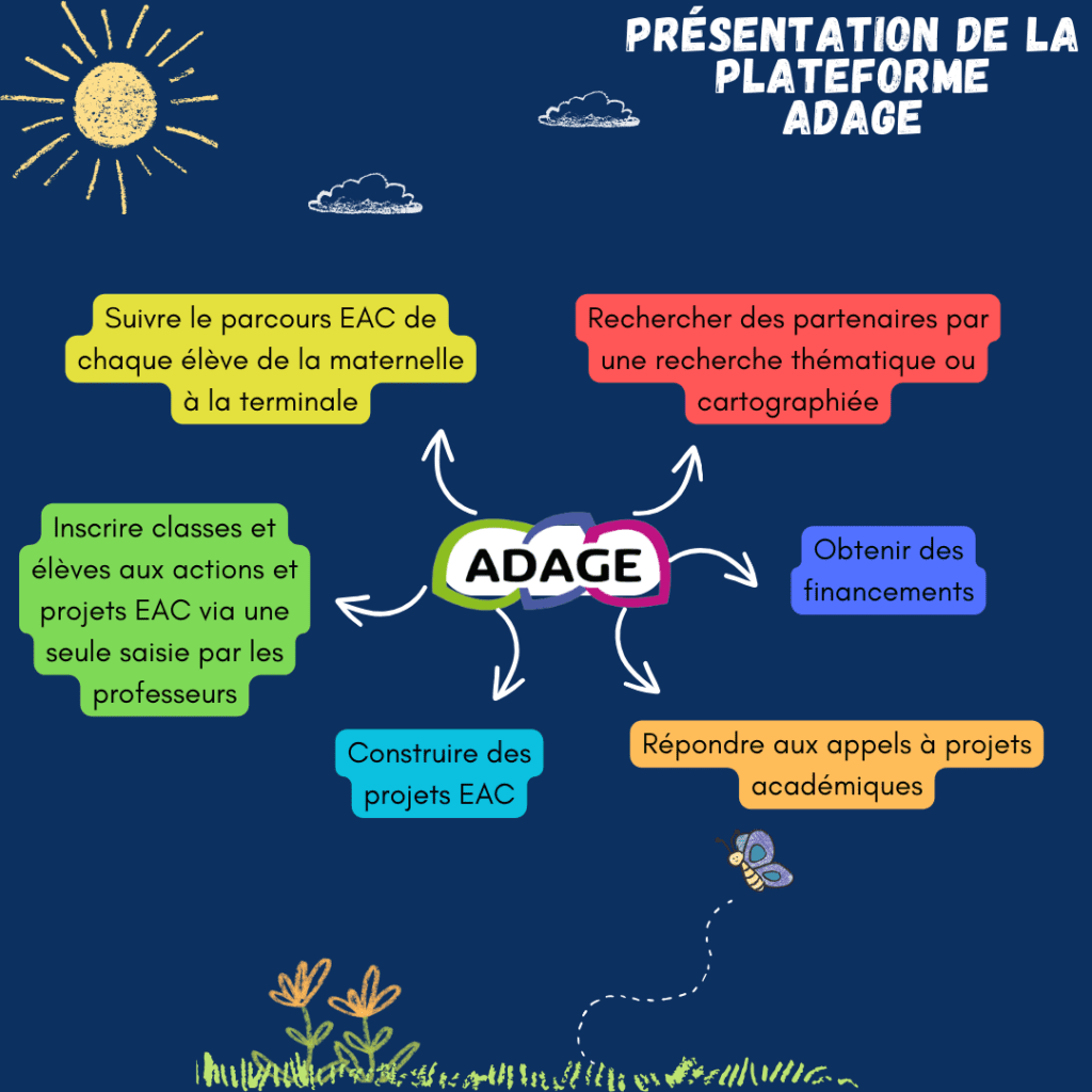 🎭 A la base, ADAGE permet de recenser le parcours culturel et artistique des élèves. Par la suite, d’autres fonctionnalités ont été ajoutées comme le fait de pouvoir obtenir des financements en lien avec des projets EAC. On peut également participer à des concours (comme les Petits Champions de la Lecture, la Danse des JO, etc.), recenser des projets EDD ou même rechercher des artistes et intervenants dans notre secteur.