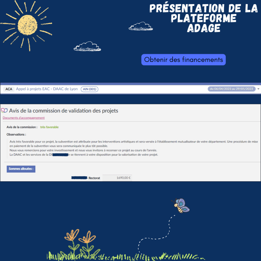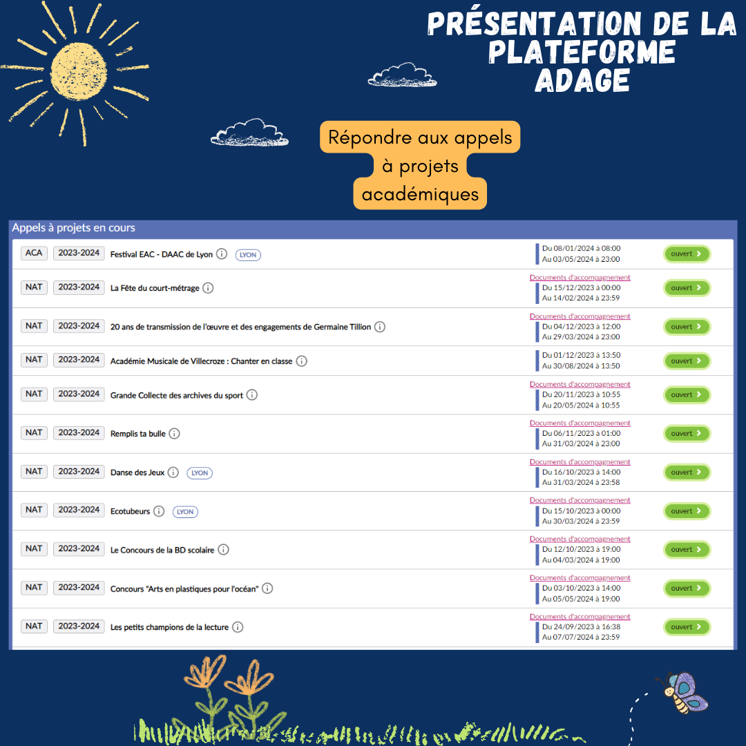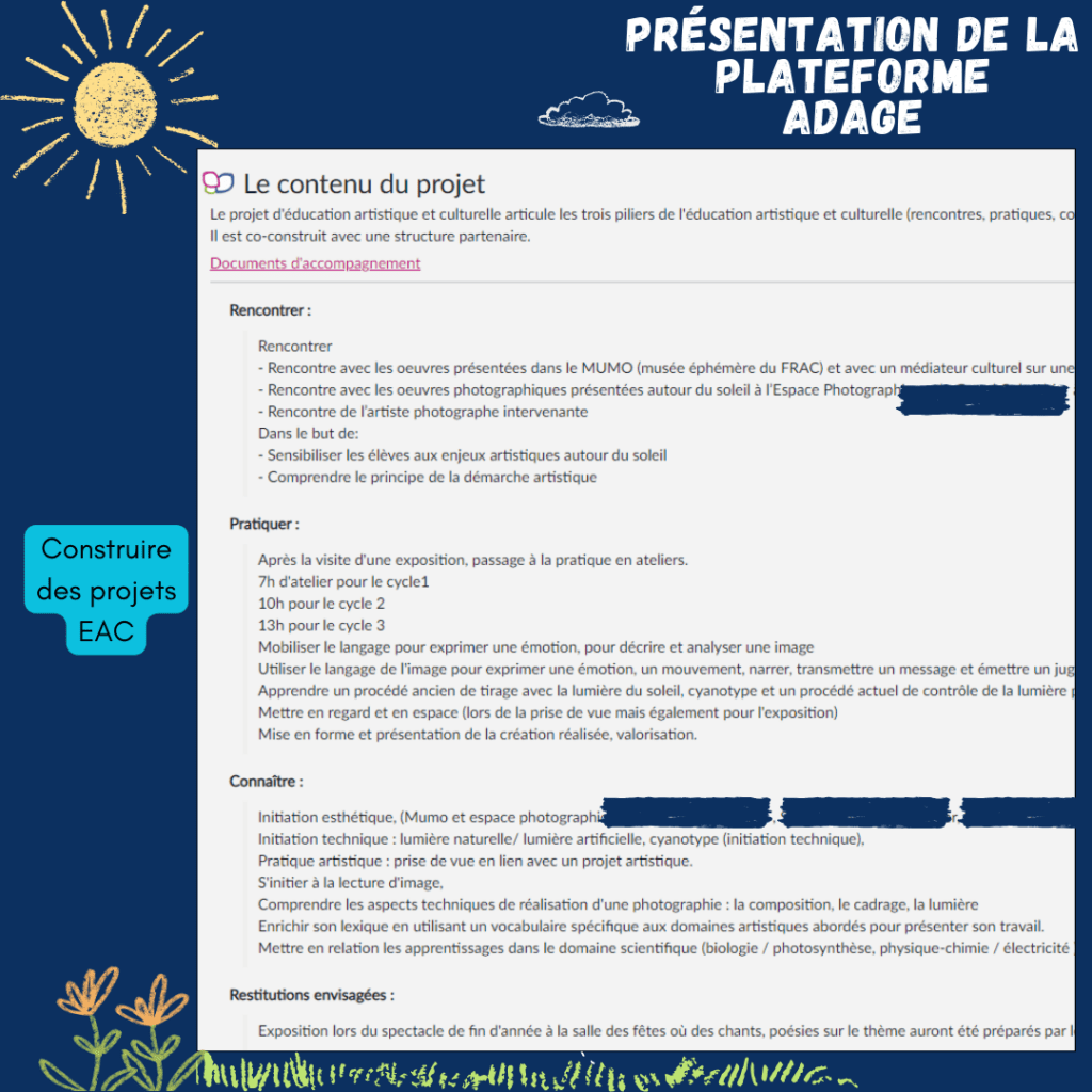 🎭 A la base, ADAGE permet de recenser le parcours culturel et artistique des élèves. Par la suite, d’autres fonctionnalités ont été ajoutées comme le fait de pouvoir obtenir des financements en lien avec des projets EAC. On peut également participer à des concours (comme les Petits Champions de la Lecture, la Danse des JO, etc.), recenser des projets EDD ou même rechercher des artistes et intervenants dans notre secteur.
