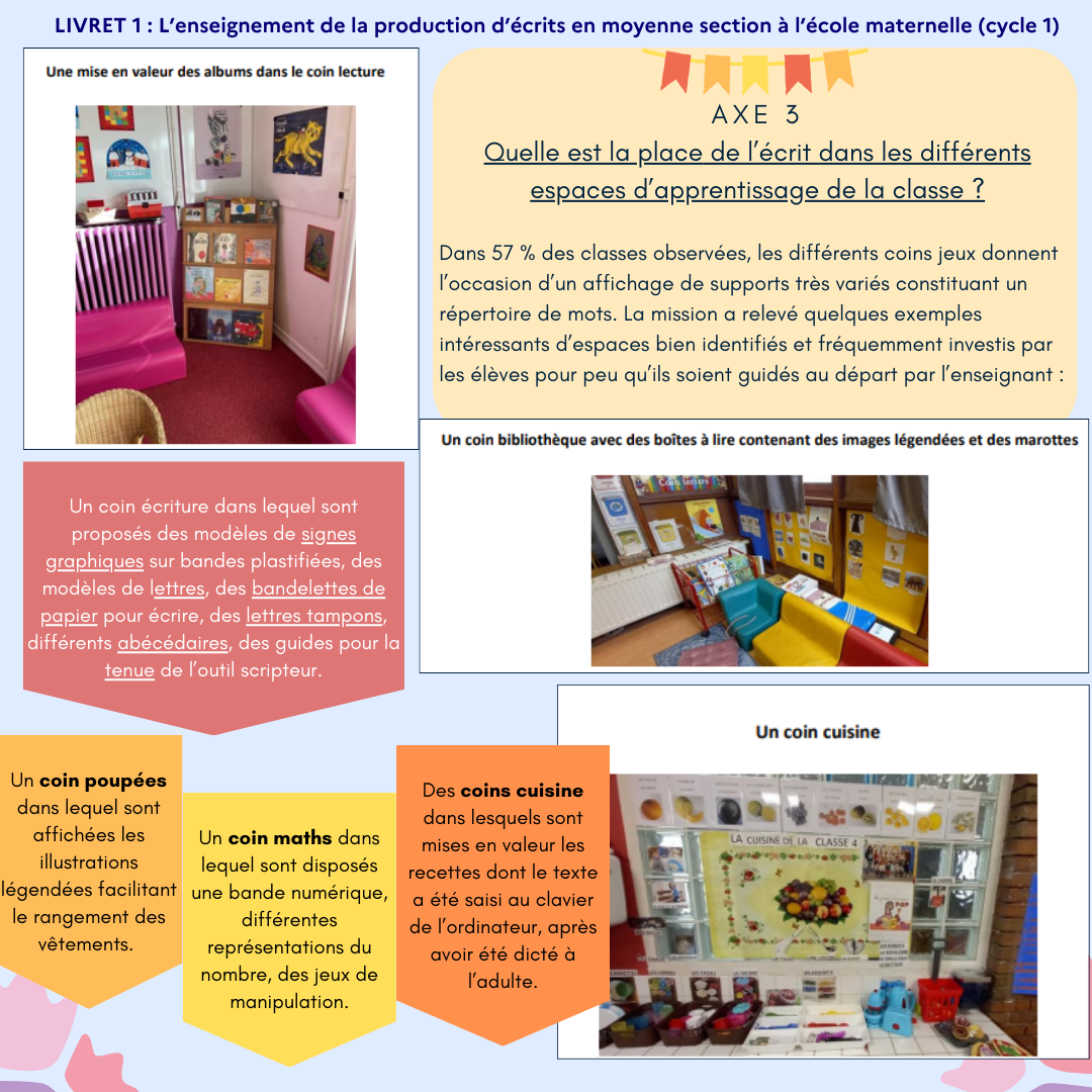 • Le livret 3 porte sur le pilotage pédagogique de l’enseignement de l’écriture et de la production d’écrits aux cycles 1 et 2. Il est destiné plus particulièrement aux inspecteurs de l’éducation nationale ainsi qu’aux autorités départementales et académiques.