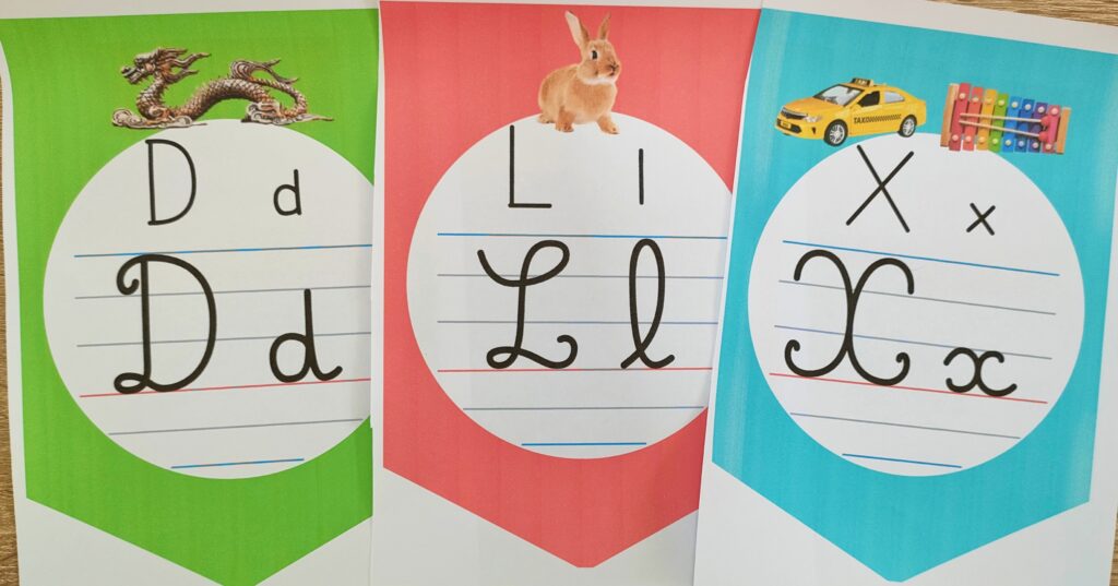 L’alphabet est généralement un support qu’on laisse accroché toute l’année dans la classe, alors que les affiches des graphèmes sont placées au fur et à mesure des apprentissages.