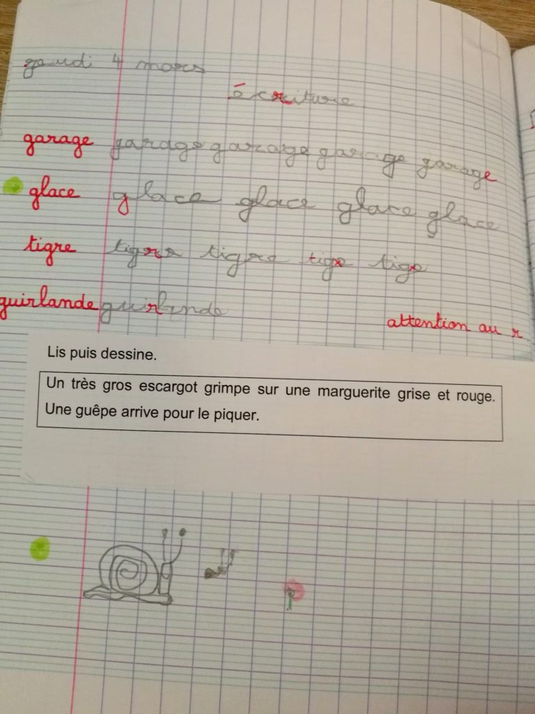 Je vous avais parlé au début d’année du premier cahier du jour de mes CP, et je me suis dit que ça faisait quelques temps que je n’avais plus pensé à prendre les cahiers en photo.