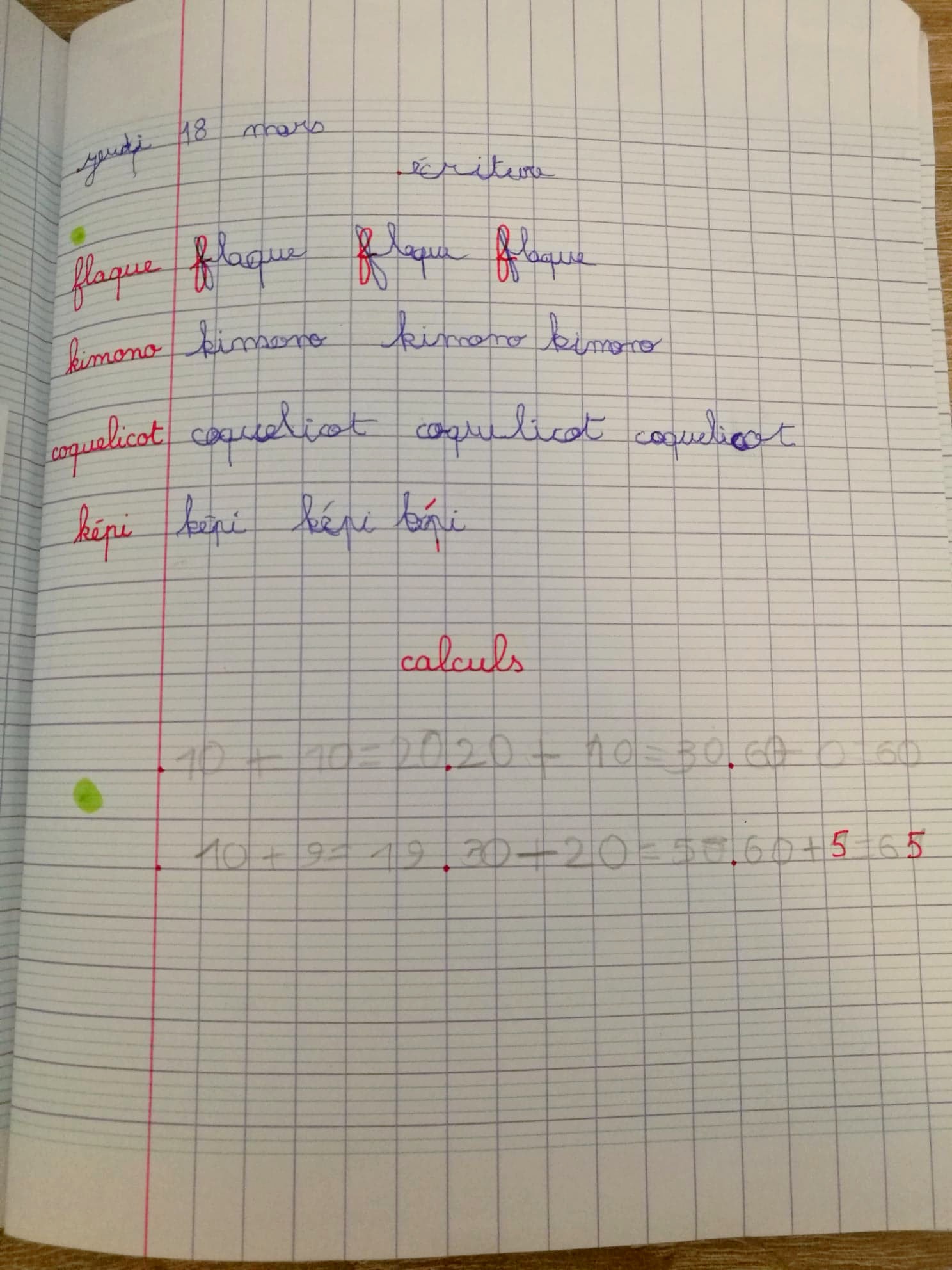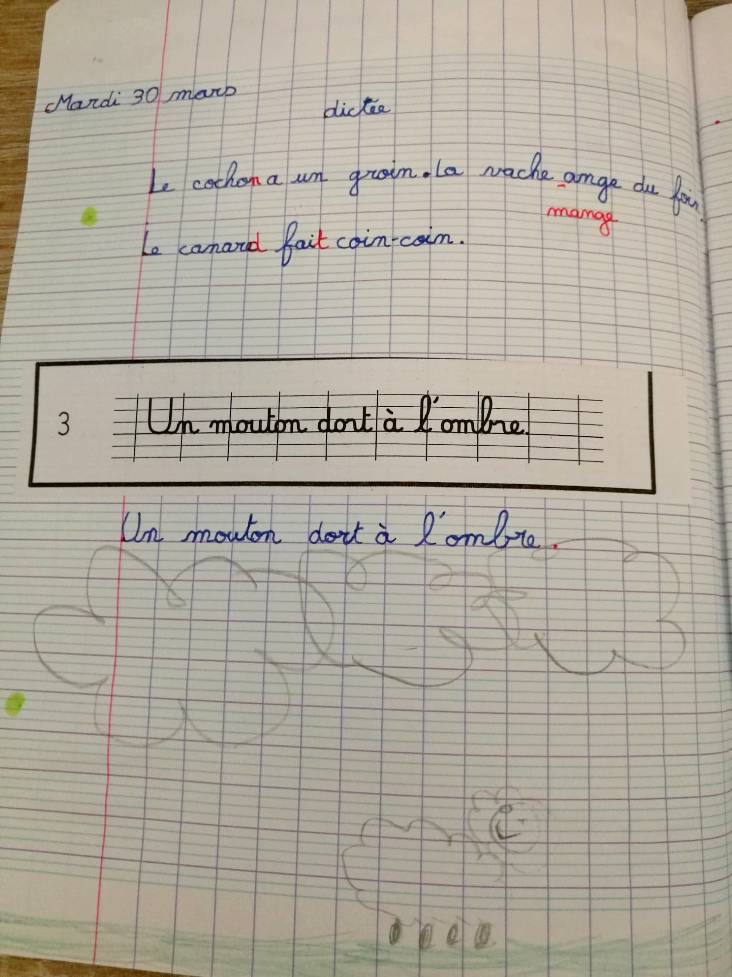 Depuis le début d’année, les activités dans le cahier se sont aussi diversifiées : écriture et dictée, de la copie, de la production d’écrits, des petits calculs, compréhensions, etc.