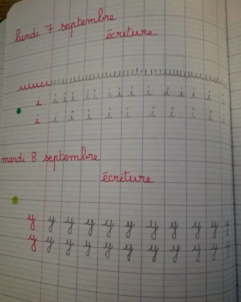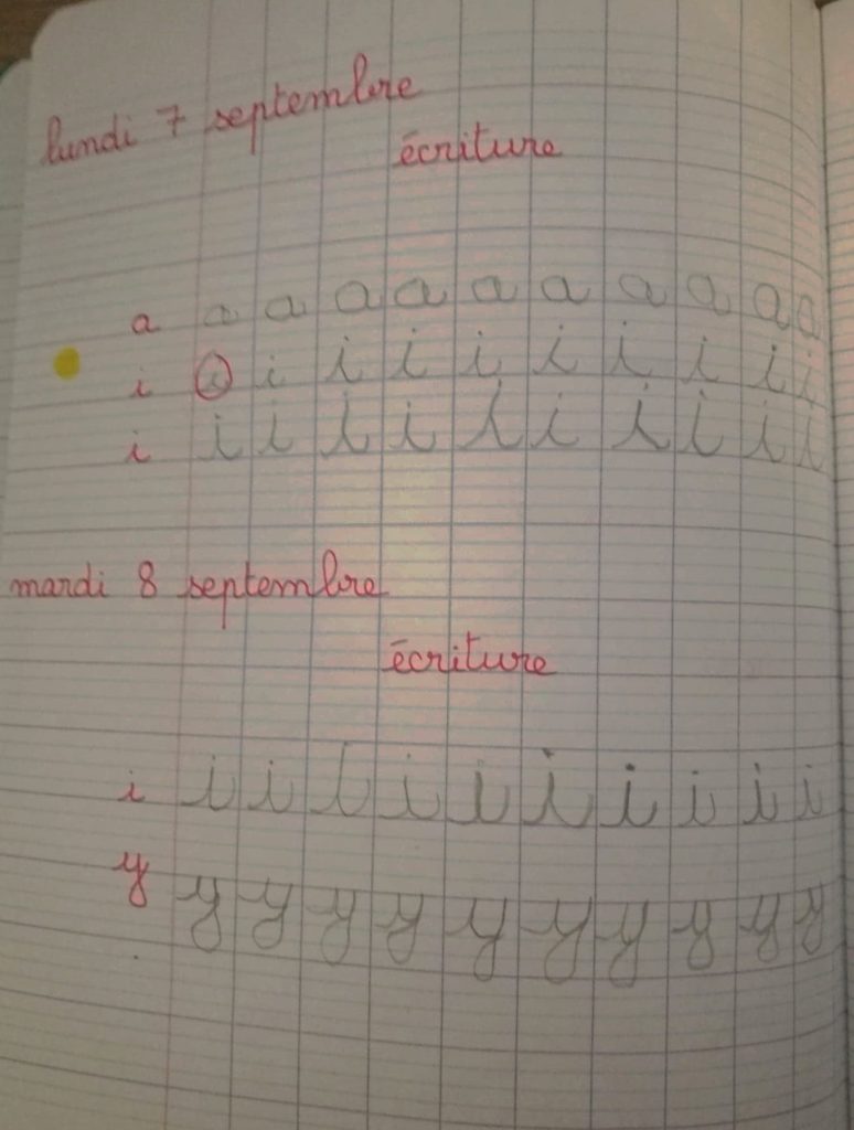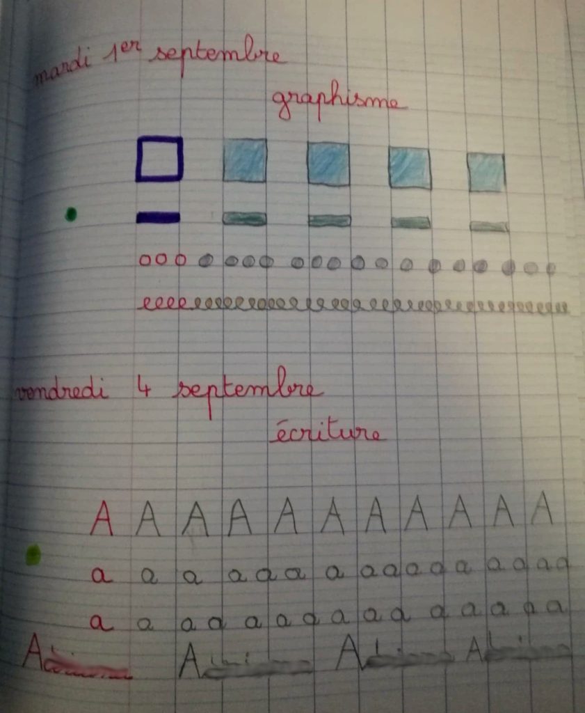 Pour l’instant, j’écris moi-même la date et le titre. Je leur demande « juste » de copier mes modèles, ce qui implique déjà de se repérer dans le cahier, dans la page et avec les lignes. Au préalable, le jour de la rentrée, je leur avais présenté ce qu’était un cahier et on avait observé le quadrillage, les lignes, les colonnes, la marges, etc.