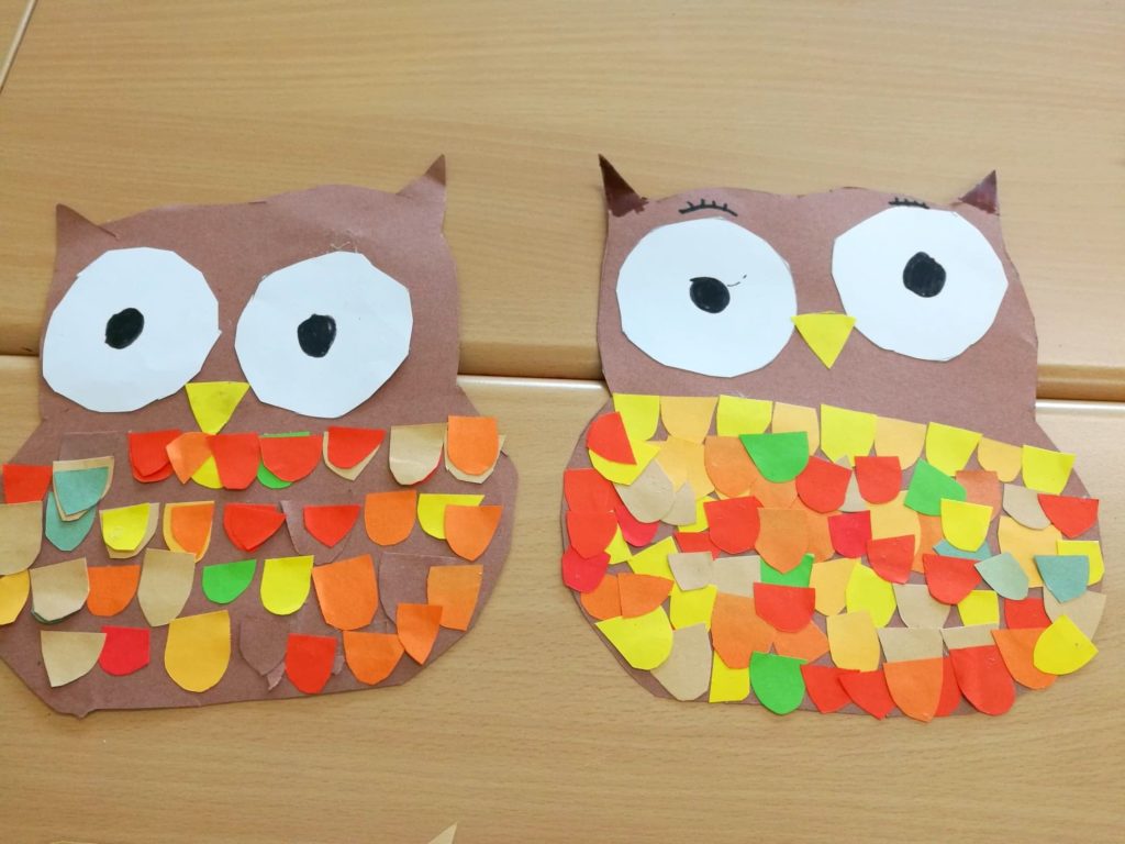 Lors de la première séance, les élèves ont tracé leurs hiboux, les yeux et le bec grâce aux gabarits. Ils ont ensuite découpé et assemblé les pièces.