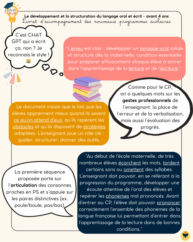 Le ministère a récemment publié un livret d’accompagnement pour la mise en œuvre des nouveaux programmes 2024 en maternelle. Ce document, destiné à guider les enseignants, met particulièrement l’accent sur le développement et la structuration du langage oral et écrit dès la petite section. On y retrouve des exemples de séquences et de séances plus détaillées, dans la même lignée que le livret d’accompagnement pour le CP.