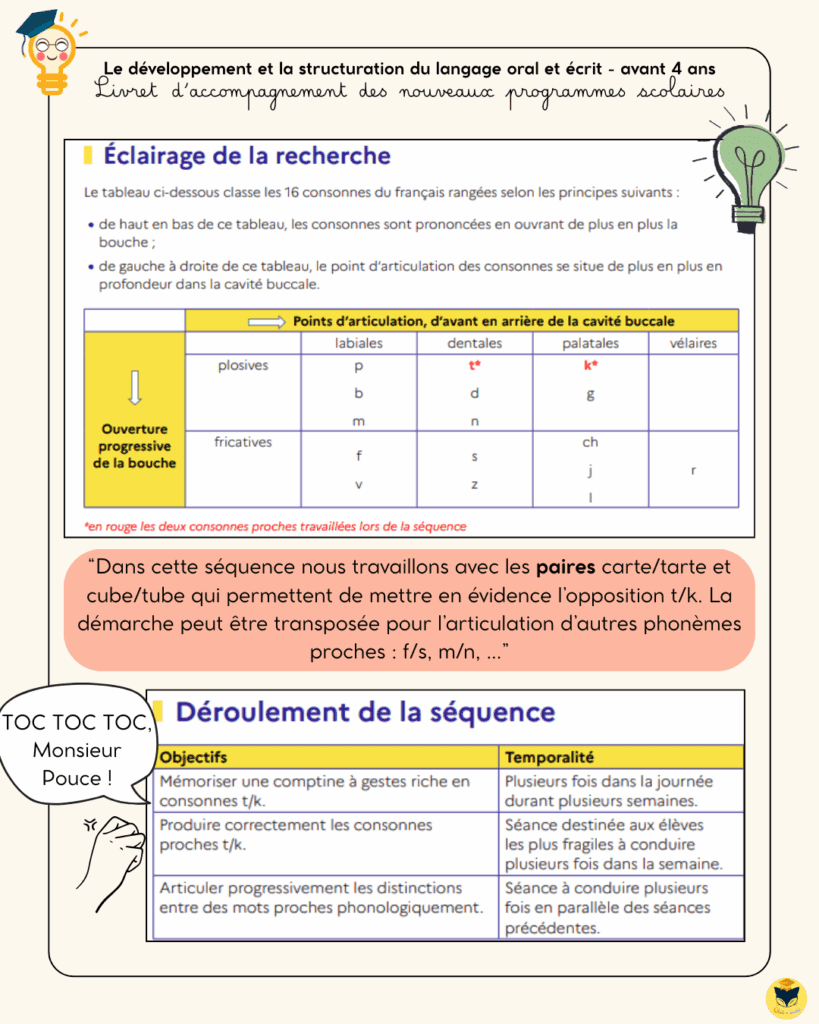 Dès l’entrée à l’école, de nombreux élèves rencontrent des difficultés d’articulation : syllabes omises, sons déformés, confusions entre phonèmes proches. Le livret insiste sur le rôle de l’enseignant dans l’écoute attentive de l’oral des élèves et la mise en place de séquences ciblées, par exemple à partir de paires distinctives (poule/boule, pas/bas, carte/tarte, cube/tube). L’objectif est de permettre à chaque élève de prononcer correctement l’ensemble des phonèmes de la langue française avant le CP, afin d’aborder la lecture dans de bonnes conditions.