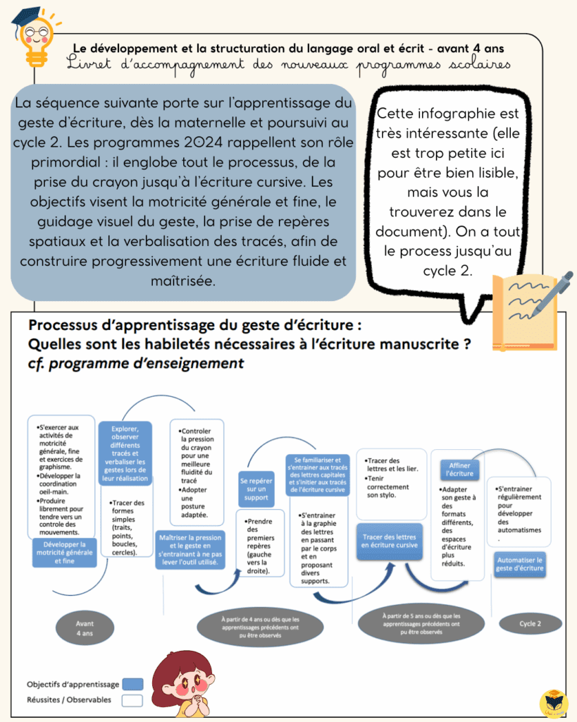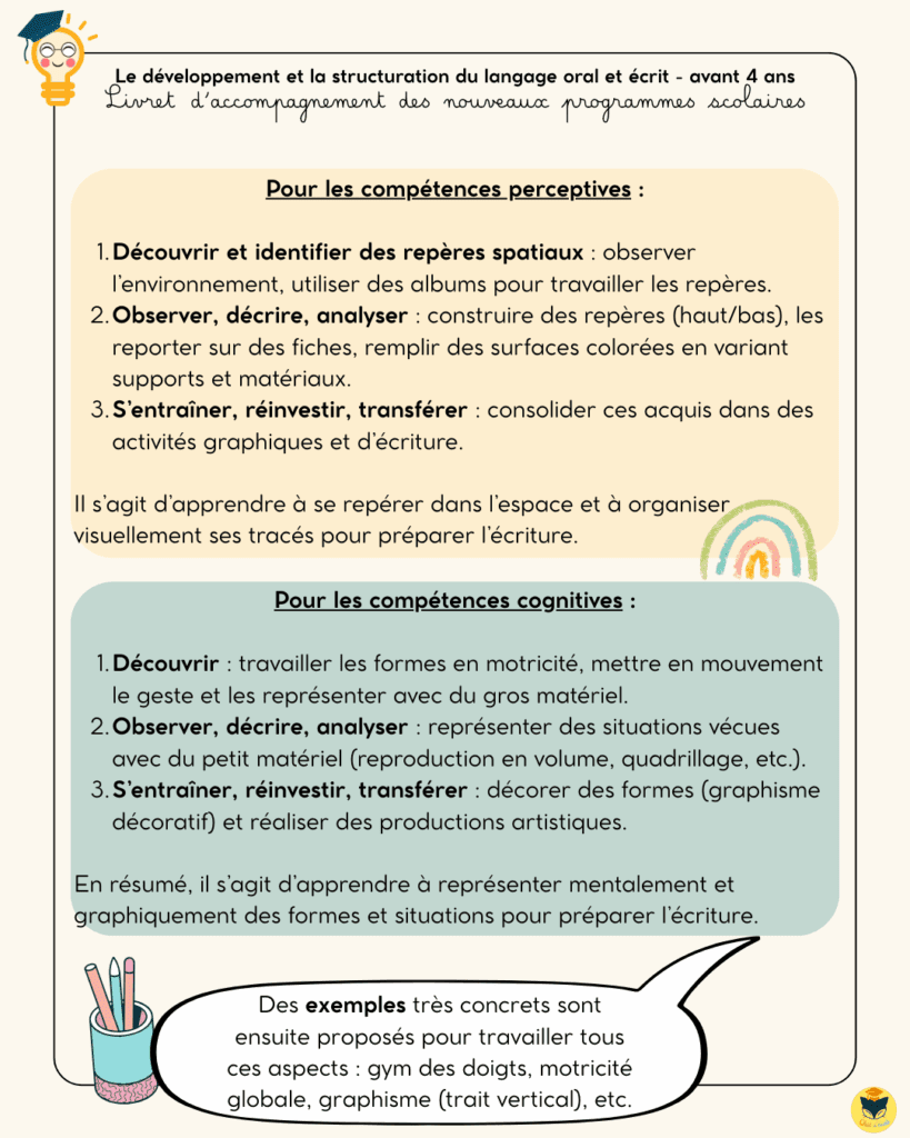 L’enseignement de l’écriture ne se limite pas au traçage des lettres. Il englobe la motricité globale et fine, la coordination œil-main, la prise de repères spatiaux et la représentation mentale des formes. Le livret rappelle l’importance d’un enseignement progressif et transversal du geste d’écriture, qui s’appuie sur trois types de compétences :
