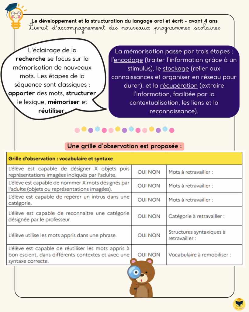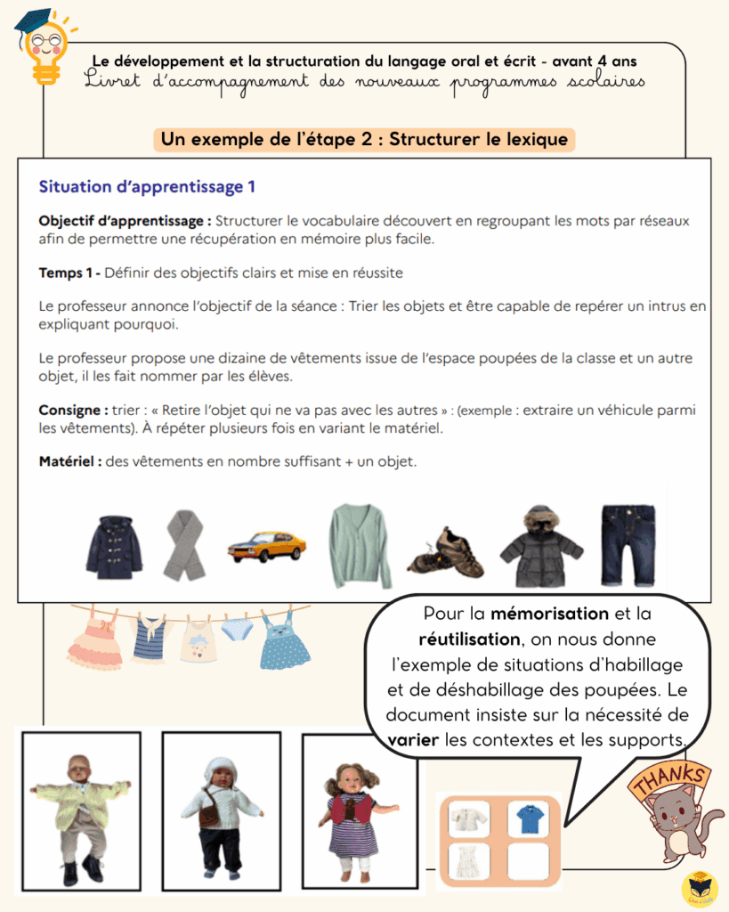Rien ne nouveau sous le soleil ici, le livret souligne la nécessité d’un enseignement explicite du lexique, en lien avec la syntaxe. Les mots doivent être organisés en réseaux et réinvestis dans différents contextes. La mémorisation est envisagée comme un processus en trois étapes : encodage, stockage, récupération. L’enseignant varie les situations et les supports pour favoriser l’appropriation durable du vocabulaire (par exemple lors d’activités d’habillage et de déshabillage de poupées).