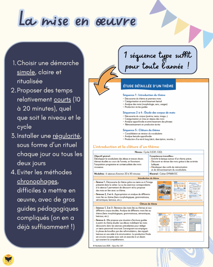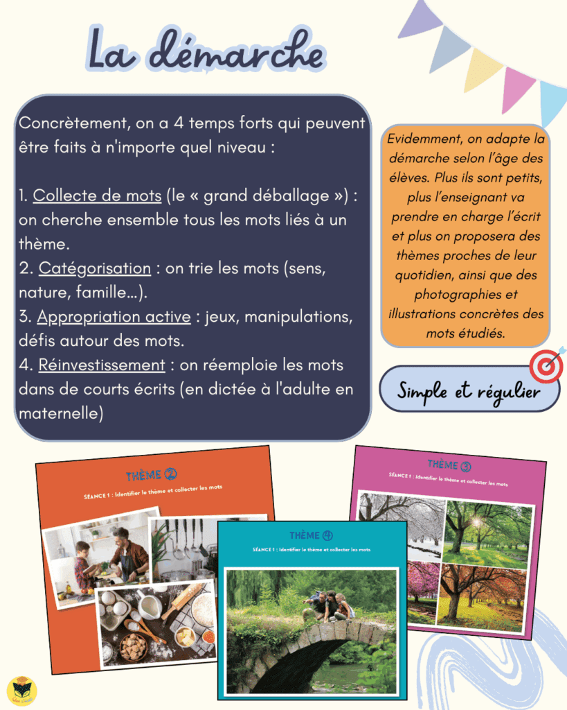 Le principe est simple : choisir un thème, explorer les mots en lien, les catégoriser, les manipuler, puis les réemployer à l’oral ou à l’écrit. Cette organisation permet de structurer l’enseignement du lexique tout au long de l’année, sans alourdir les emplois du temps.