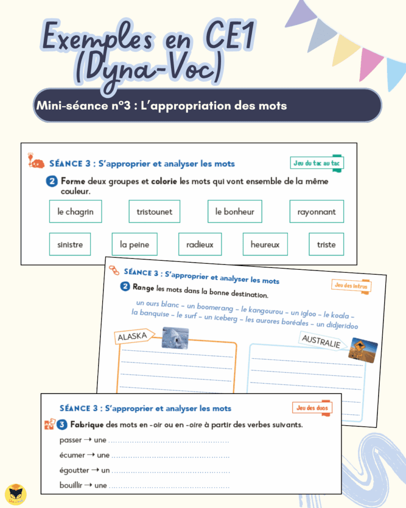 Voici l’exemple concret de Dyna-Voc : chaque thème proposé (vacances, cuisine, saisons, nature…) est accompagné de plusieurs corpus et d’activités prêtes à l’emploi. Des supports variés sont proposés pour la collecte, la catégorisation, l’appropriation et le réinvestissement des mots. La démarche est adaptable à tous les niveaux, même en maternelle, avec des ajustements simples.