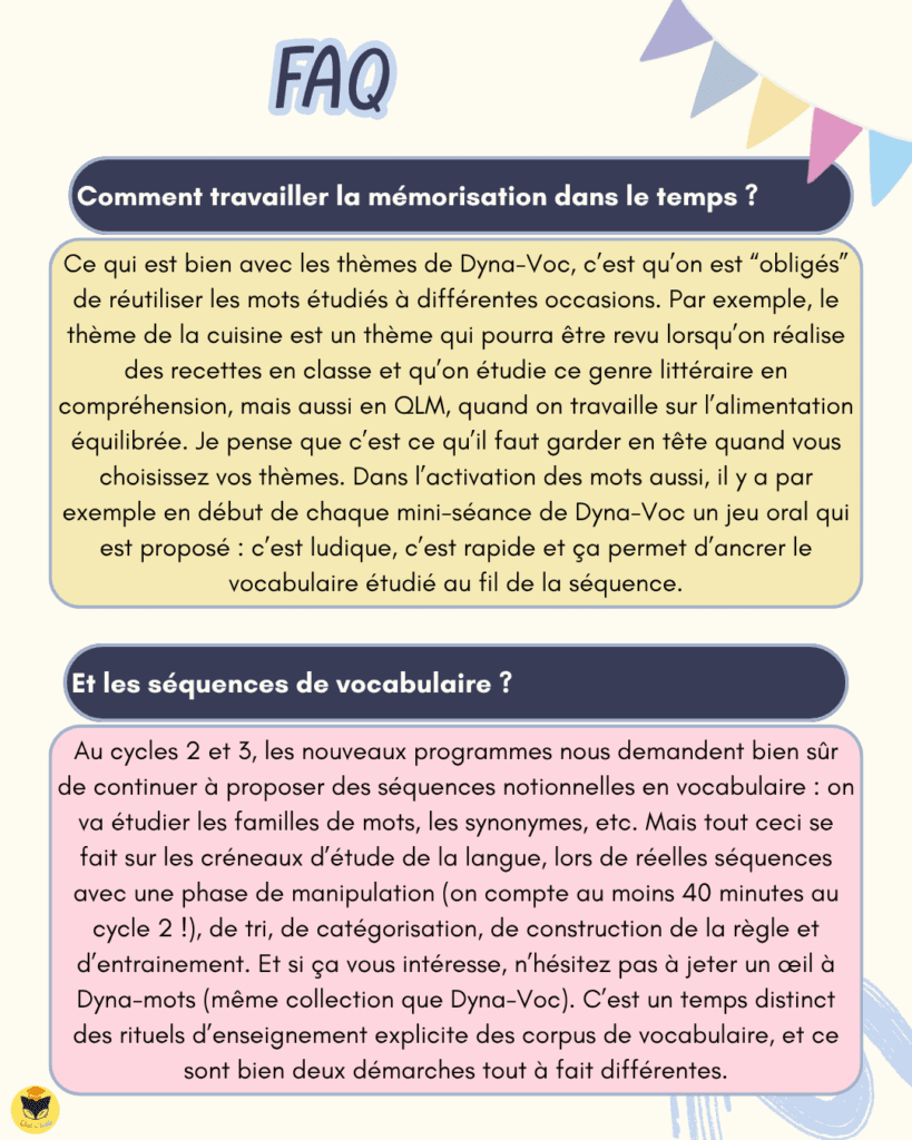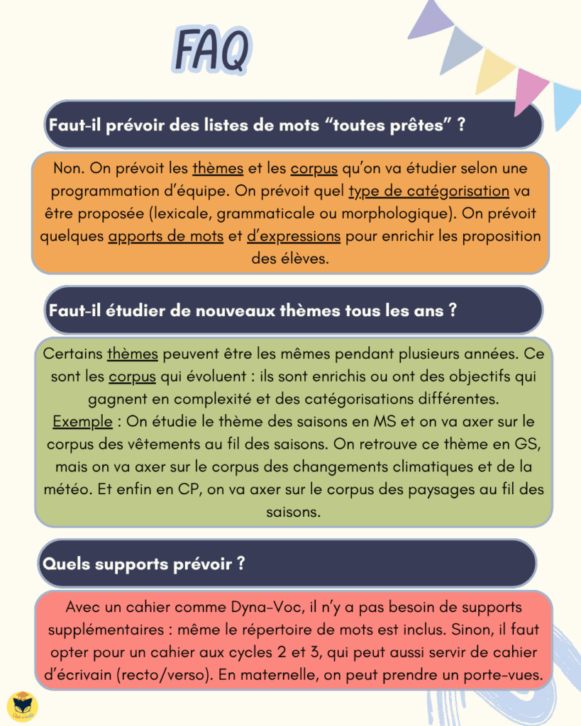 Et pour ceux qui souhaitent approfondir, une FAQ vient répondre aux questions les plus fréquentes : faut-il prévoir des listes de mots ? Est-ce compatible avec les séquences de vocabulaire notionnel ? Etc.