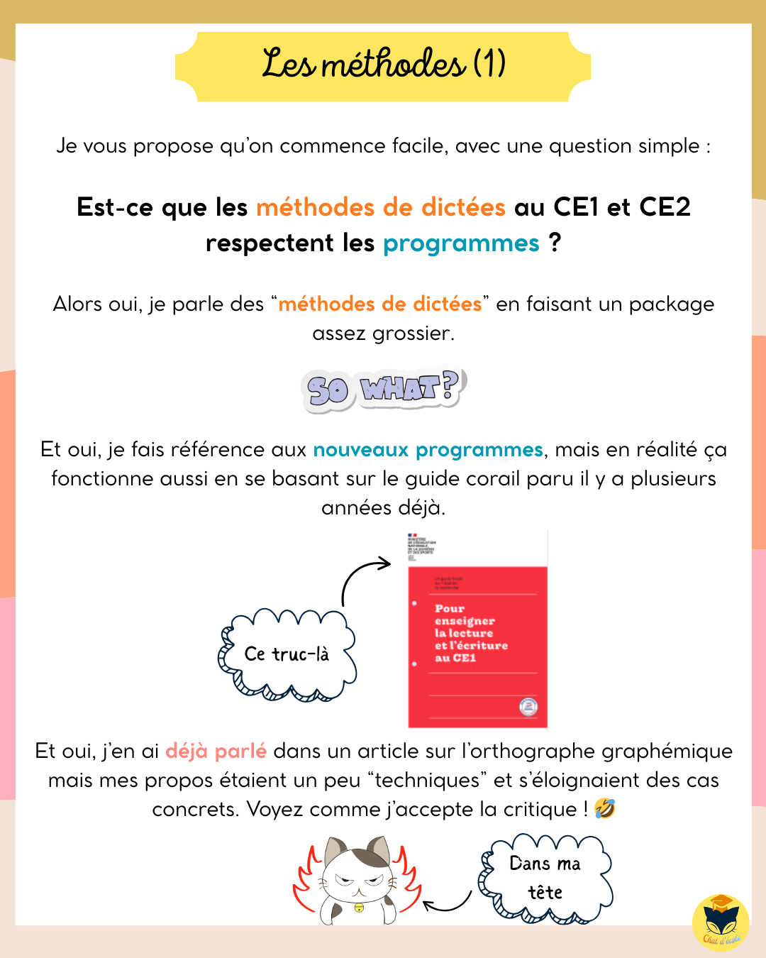 D’abord, il ne s’agit pas de juger. Les collègues qui utilisent une méthode de dictées au quotidien ont déjà le mérite d’avoir une pratique installée et structurée. C’est une vraie chance, et ce n’est pas rien dans le quotidien d’une classe. Il n’est pas question ici de culpabiliser qui que ce soit ni de dire qu’une méthode est « bonne » ou « mauvaise ». Je ne suis personne pour faire cela, et je précise donc qu’il s’agit là d’une réflexion personnelle.